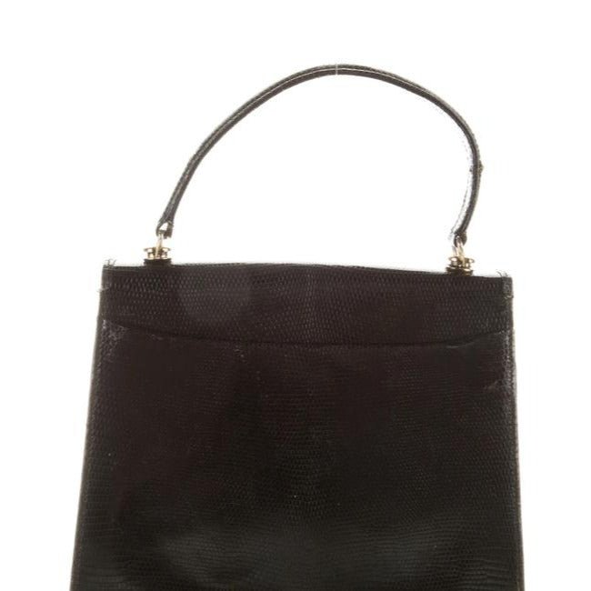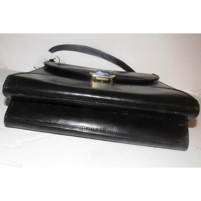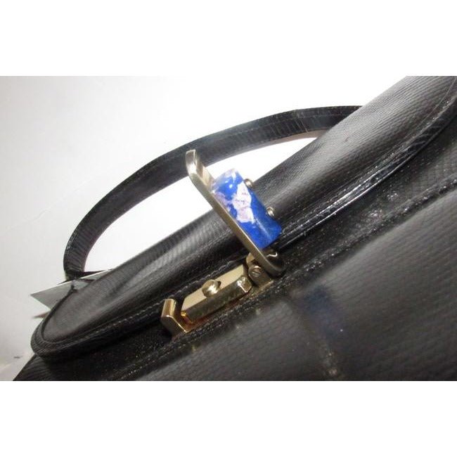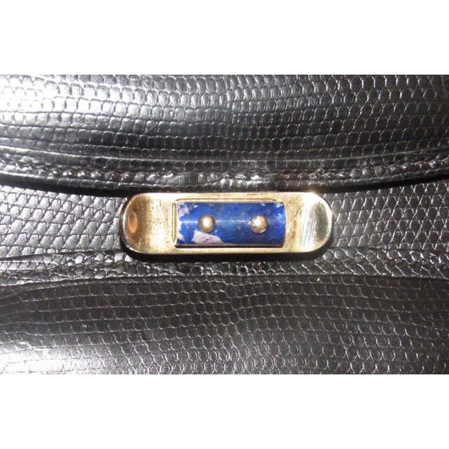 For sale is a 1960’s mod Gucci, unique, glossy black lizard skin leather, top handle Kelly style bag with a beautiful, blue, lapis lazuli accent at the clasp, an envelope top closure, a hidden pocket at the front with a fold-over top, twist lock closure, bold gold hardware, and interior and exterior compartments and pockets to keep you organized! It is a unique take on a classic, 1960’s mod, Kelly style satchel that would be great used as an everyday black purse or for special occasions!