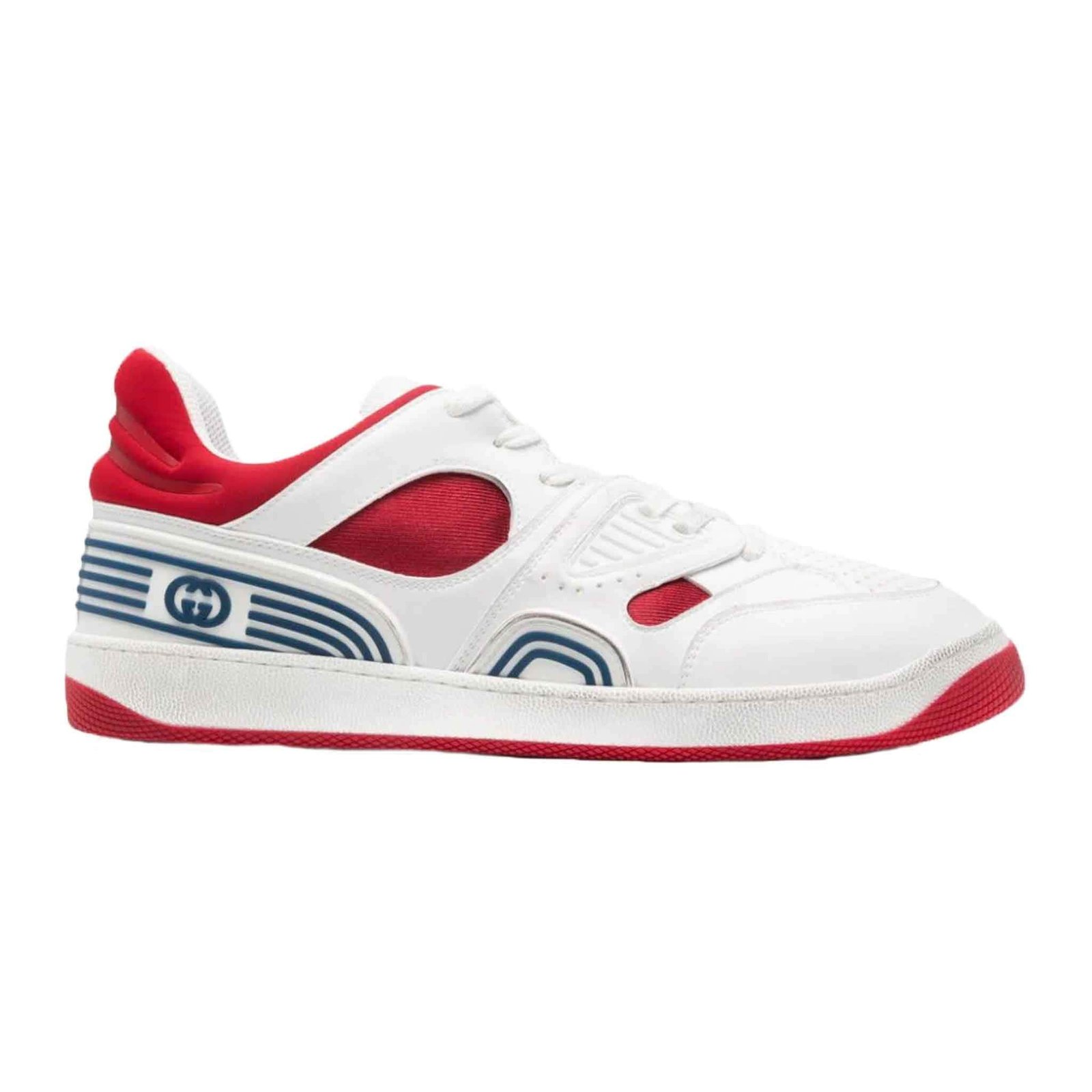 Experience the perfect blend of style and comfort with our Gucci Basket Low-Top Sneakers. The white and red canvas colour-block design, along with the GG Supreme canvas and logo patch details, make these sneakers a fashion statement. Distressed look. Featuring a round toe, front lace-up fastening, and branded insole, these sneakers are perfect for any occasion. Walk with confidence on the flat rubber sole.