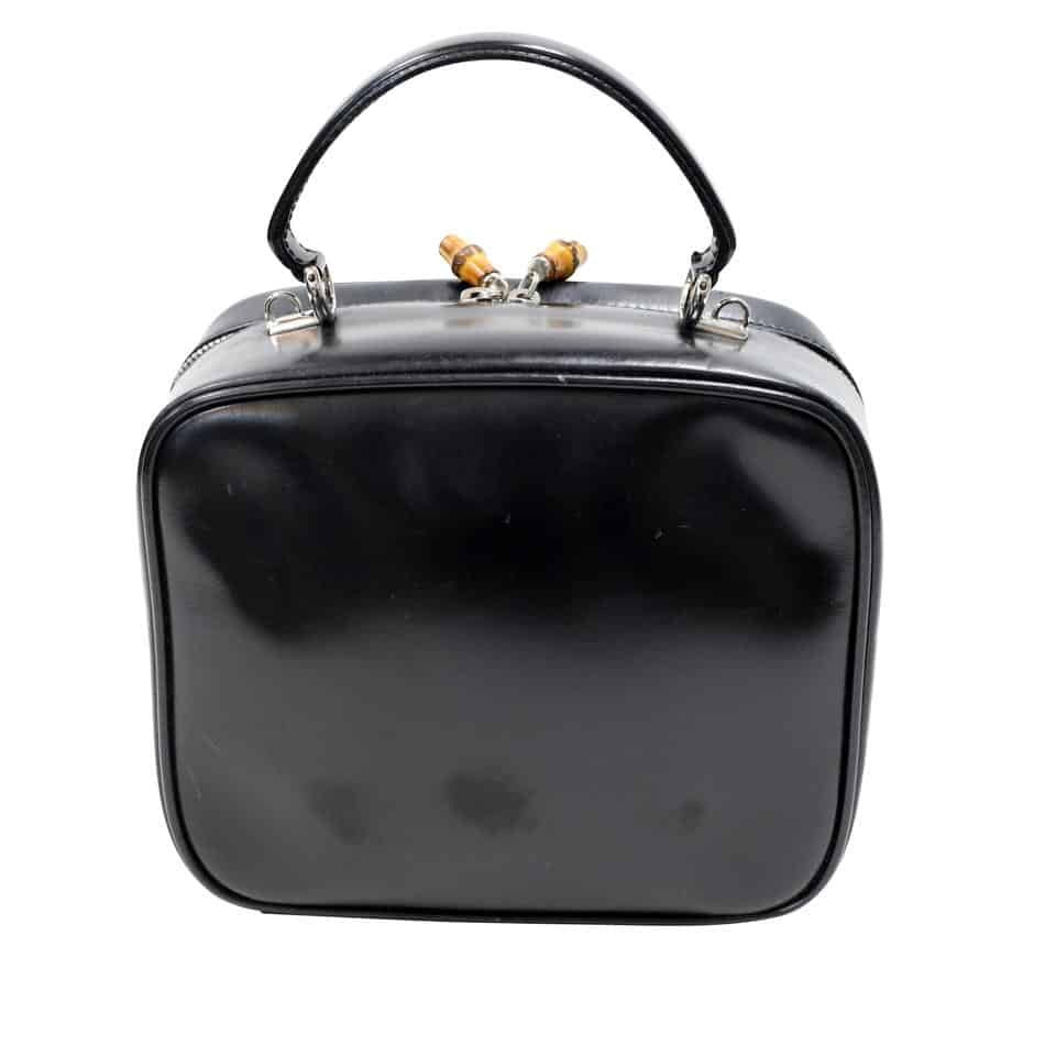 Gucci signature black bamboo style with leather gloss detail. The bag is perfect for traveling and hold all your daily essentials. Bag can be used for any business trip or overnight stay. The bag includes Scratches on the front and corner wear. The interior includes peeling and wear from being stored. Bag includes a 3 inch strap.