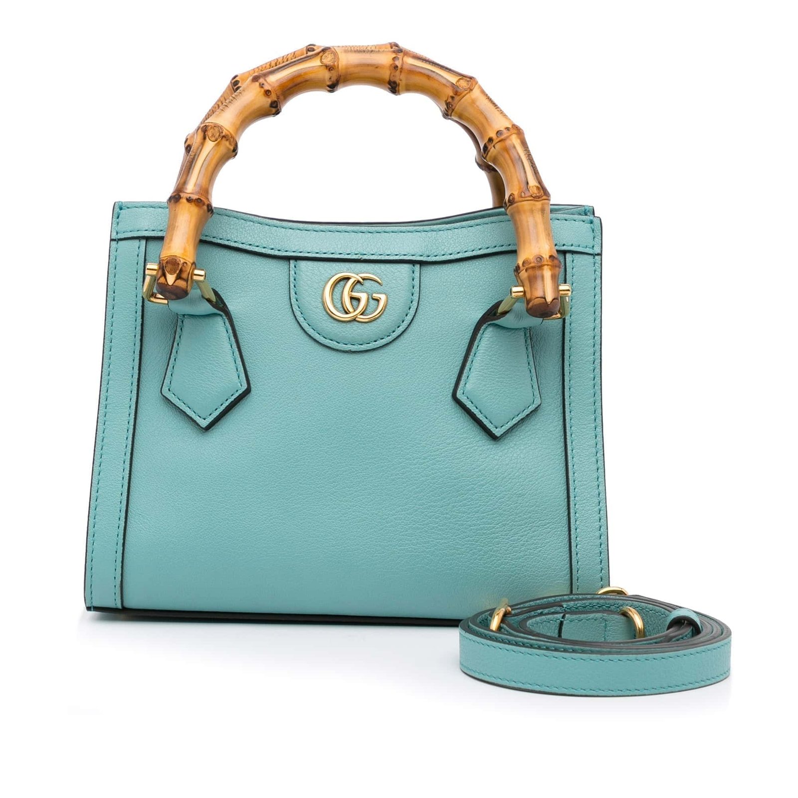 This stunning Gucci Diana has a green leather body with bamboo handles, a detachable flat leather strap, gold-tone details and an additional Sylvie Web shoulder strap. The top has a magnetic closure. The Bag can be over the arm or over the shoulder.