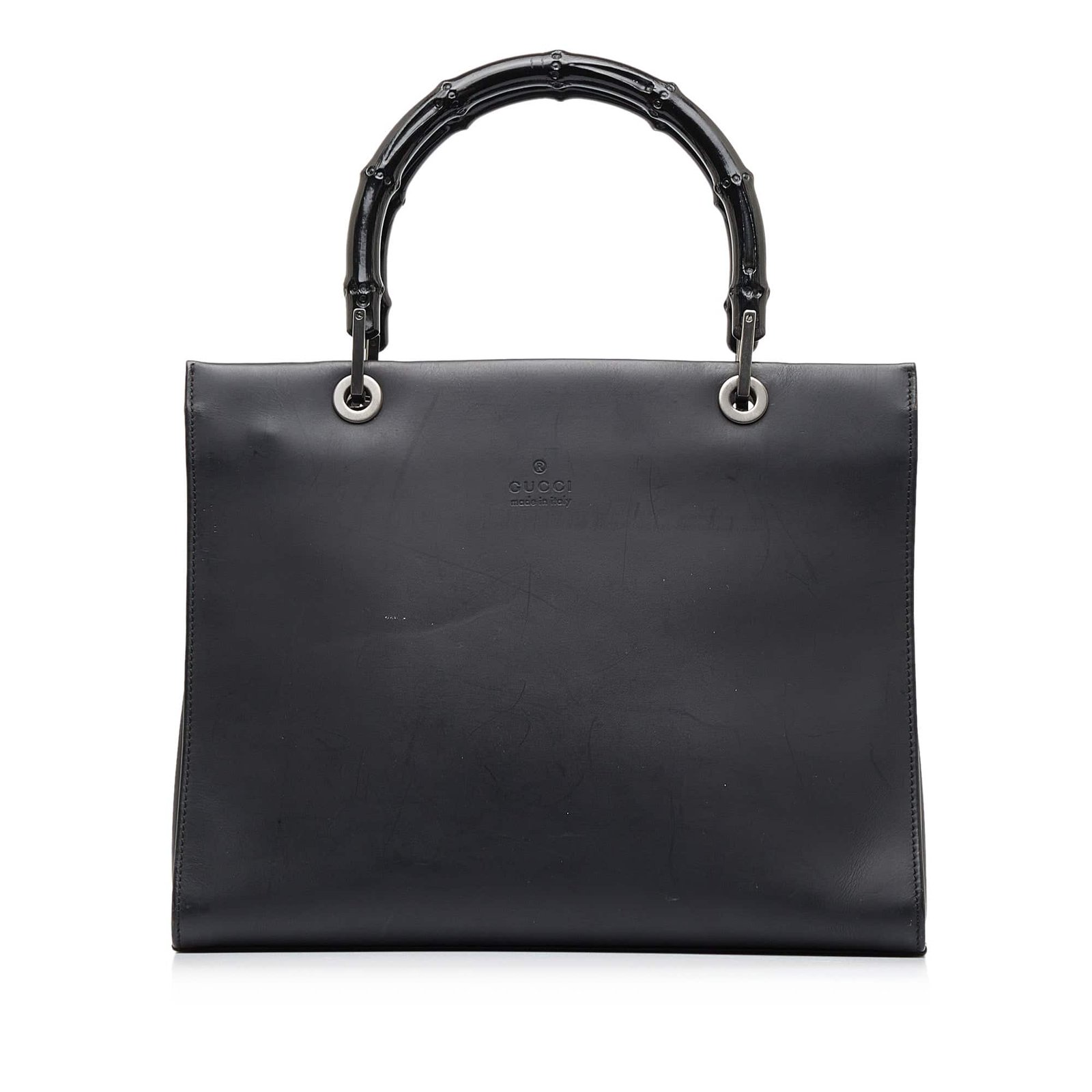 This stunning Gucci Bamboo handbag is made of black leather and features a black bamboo handle, a detachable flat leather strap, an open top and a zippered compartment on the inside. It is preferably over the arm or loosely over the shoulder.