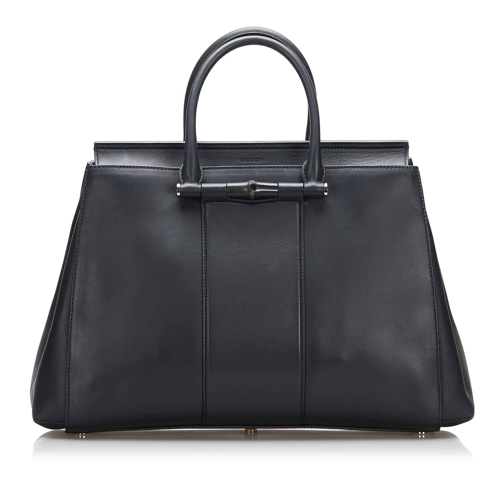 This satchel features a leather body, a rolled top handles, bamboo detail, a detachable flat leather strap, an open top with magnetic closure, and interior zip and slip compartments. Comes with box and dust bag.