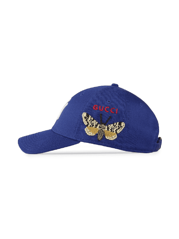 The Gucci Baseball Cap With NY Yankees™ Patch In Blue features a recurrent motif, while an embroidered butterfly appliqué adorns the side of the cap with ‘Gucci’ embroidery. This baseball cap showcases the Yankees symbol in white on the front, while the back includes an adjustable closure from 22.5′ to 24′.