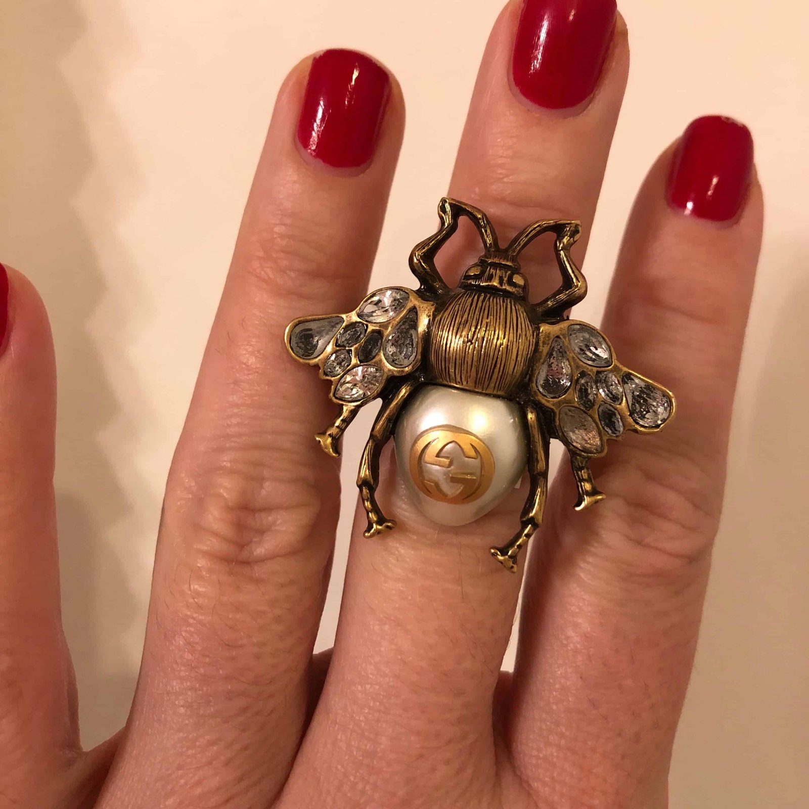 - Gucci Bee Ring in Antique Gold with Crystals and Pearl