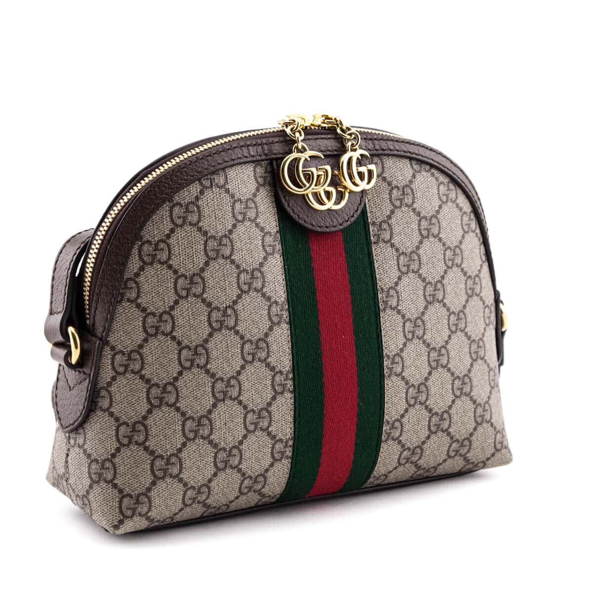 This Gucci Ophidia GG Shoulder Bag perfectly captures the luxurious romanticism known to the Italian designer fashion house. Composed of the signature beige GG Supreme monogram coated canvas, this preBlara Bagsd Gucci handbag complements its neutral-toned print with gold-tone hardware, and brown leather trim throughout. A leather panel at the base preserves this luxury handbag’s body. Wrapping the center of the rounded silhouette is a panel of green and red striped webbing, ensuring that this designer handbag receives due recognition. A rounded tab at the front wall displays the iconic interlocking GG logo. Complete with a slender adjustable strap, this Gucci handbag can be worn on-shoulder or crossbody. Secure your essentials in the teal satin-lined interior via the two-way zipper with GG logo zipper-pulls. Offering ample organization, the internal compartment features two ‘smartphone’ slip pockets, and one large slip pocket at the reverse. Presenting Gucci’s most recognizable signatures, this Gucci GG Supreme Small Ophidia GG Shoulder Bag begs to be toted all over town.