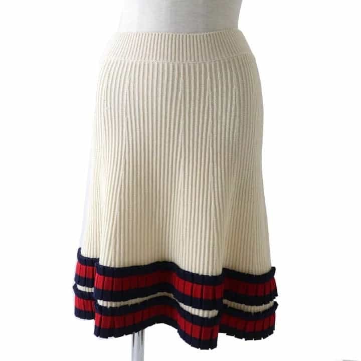 This elegant Gucci skirt in pristine condition is a must-have for any fashion-forward wardrobe. Crafted from high-quality wool, the ivory hue provides a sophisticated and versatile aesthetic. The ribbed design and bold tri-color hem add a unique touch that stands out while maintaining classic elegance. Ideal for both casual and formal occasions, this skirt offers unparalleled comfort and style. Elevate your outfit with this luxurious Gucci piece and make a lasting impression wherever you go.