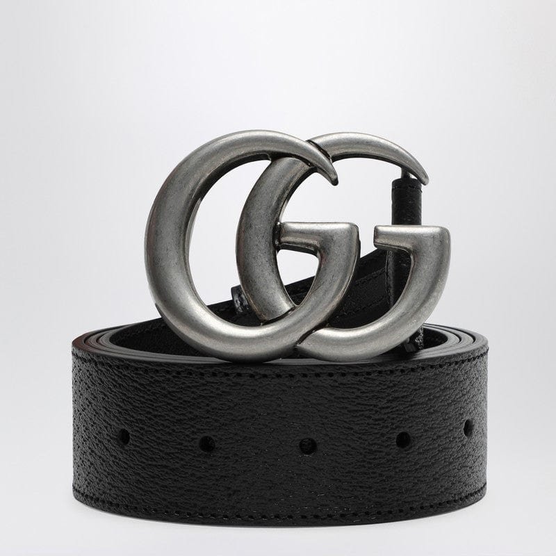 Black leather belt by Gucci, featuring a palladium-ton double G buckle. Height 4 cm Model wears size 85 cm Model measurements: Height: 186 cm Chest: 93 cm Waist: 76 cm Hips: 96 cm