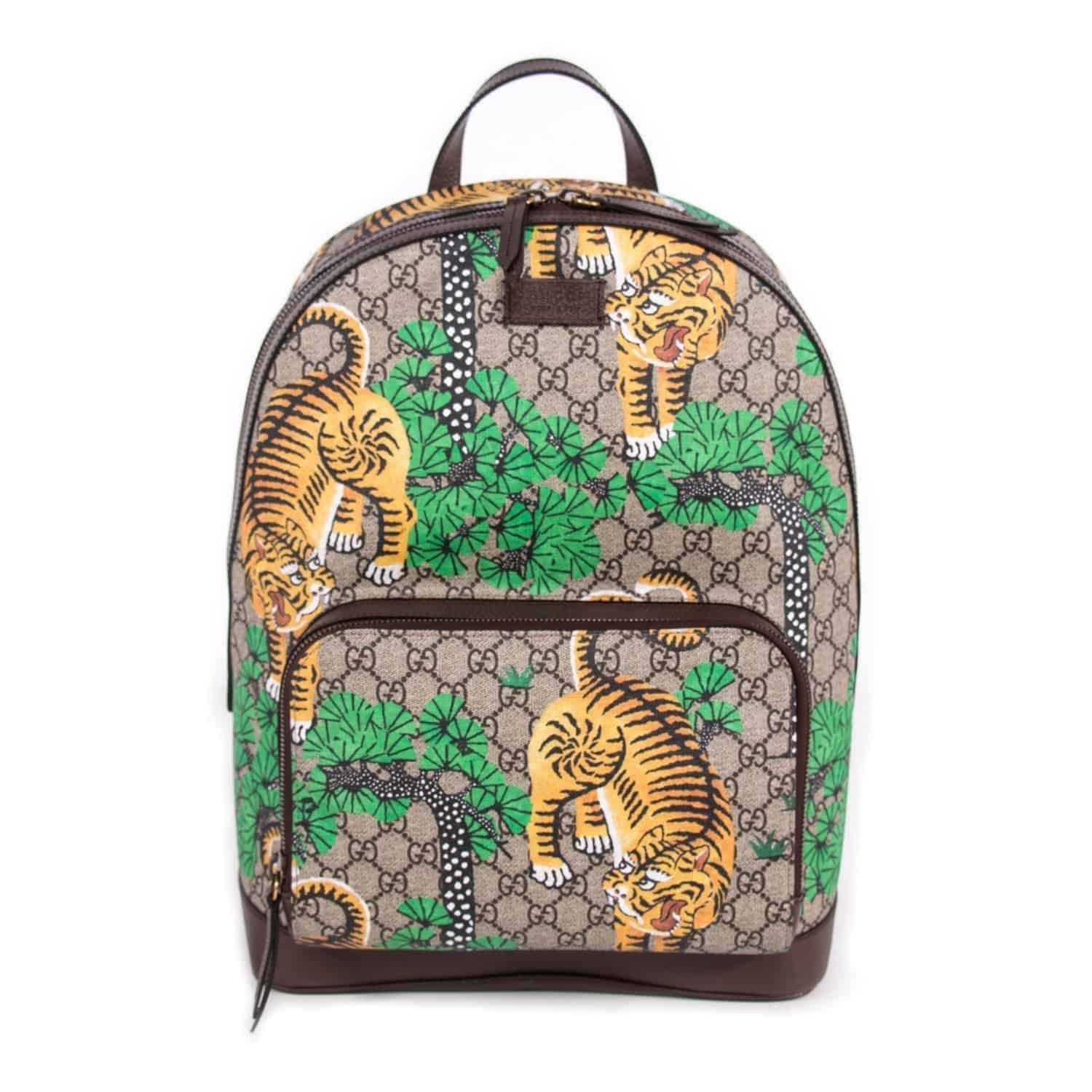 Details: Beige-Ebony GG Supreme Coated Canvas With Gucci Bengal Print / Brown Leather Trim / Embossed Logo Patch At Front Face / Adjustable Signature Green And Red Web Straps / Flat Leather Handle / Brass Hardware / Exterior Zip Pocket At Front Face / Microfiber Lining With Suede Finish At Interior / Interior Pocket For Laptop / Two Smartphone Pocket / Two-Way Zip-Around Closure