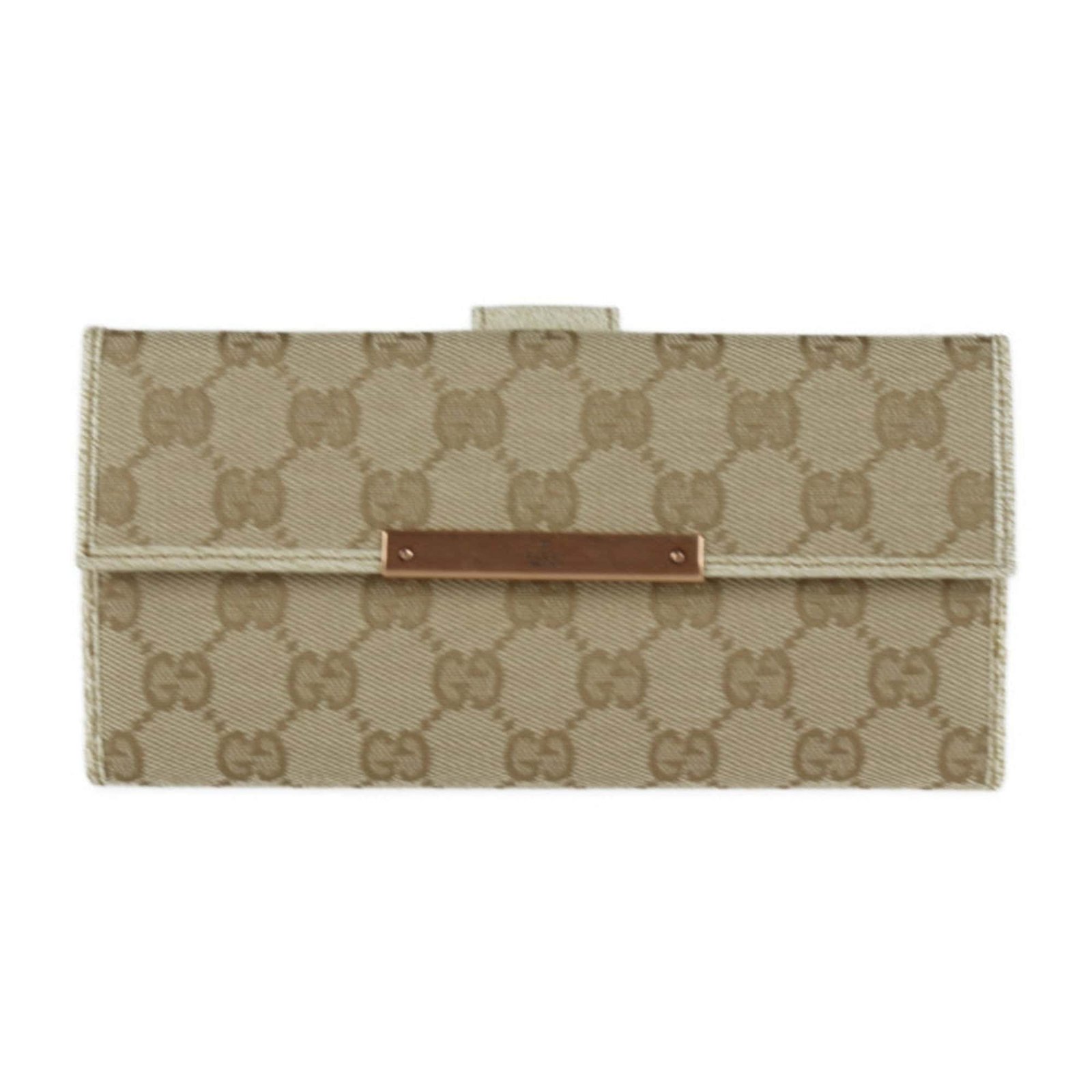Gucci Bifold Wallet 112715 GG Canvas Leather Gold Beige Ivory Bronze Hardware W Hook Long Logo Plate