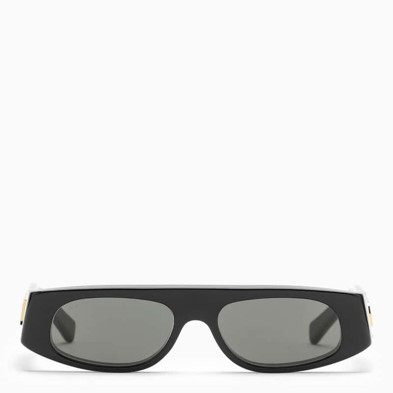 Black shiny acetate sunglasses from Gucci featuring a geometric shape, embossed gold-tone metal logo on the temples and solid grey lenses.