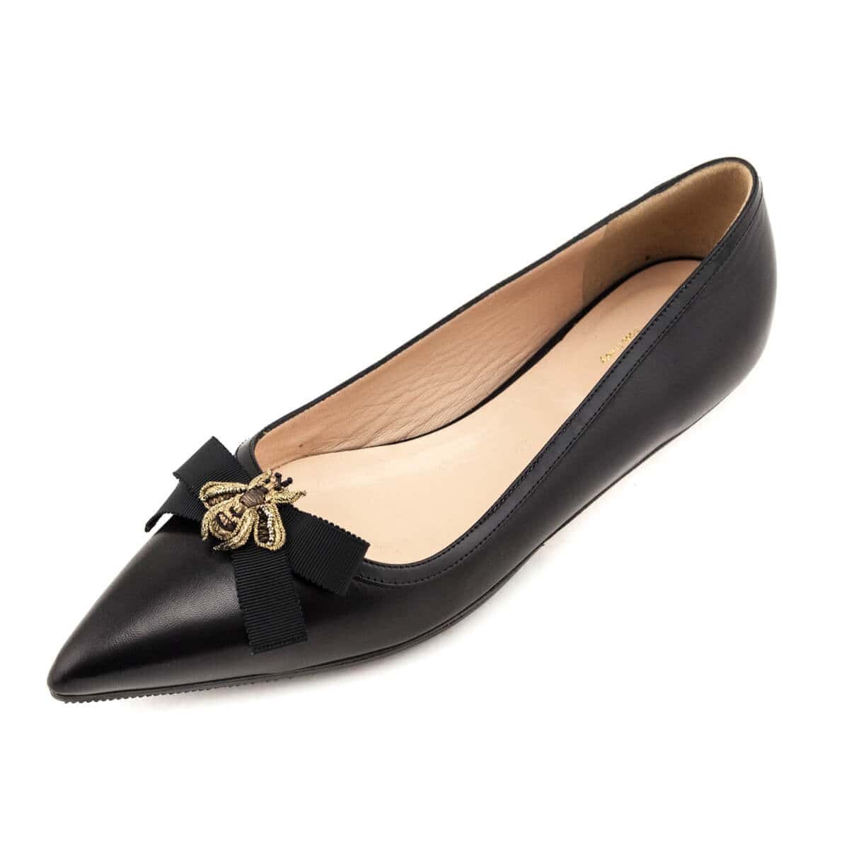 Playful and elegant, these Gucci Bee Ballet Flats are a comfortable workwear must-have. Made from the finest Italian leather, these black designer flats present a pointed-toe silhouette and black patent trim along the top perimeter. Each vamp features a tonal grosgrain ribbon bow along with a gold and brown embroidered and beaded bee for subtle flair. The soles along with the subtle heel are resoled for added traction and protection. Style these luxury flats with a matching pant suit and a bright designer top handle bag for a chic office ensemble.
