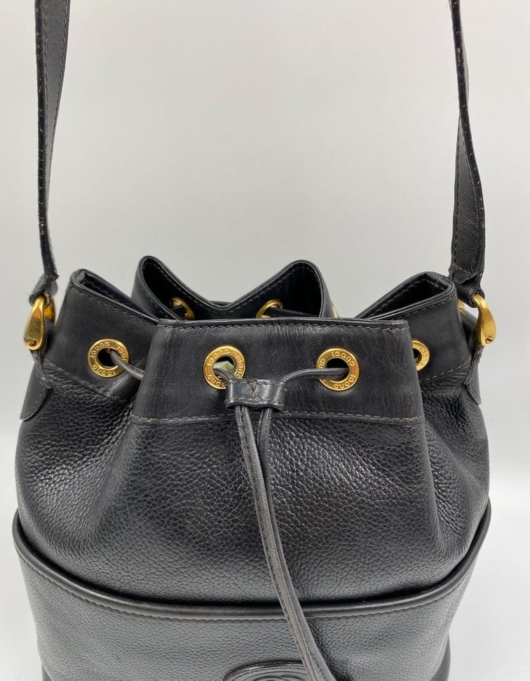 A vintage Gucci black leather bucket bag with gold Gucci branded hardware. The strap is adjustable via a buckle and can be crossbody or on the shoulder. The shortest strap drop is 38cm and the longest 45cm. This bag is lined with a black suede and there is an interior zipped pocket for your valuables.