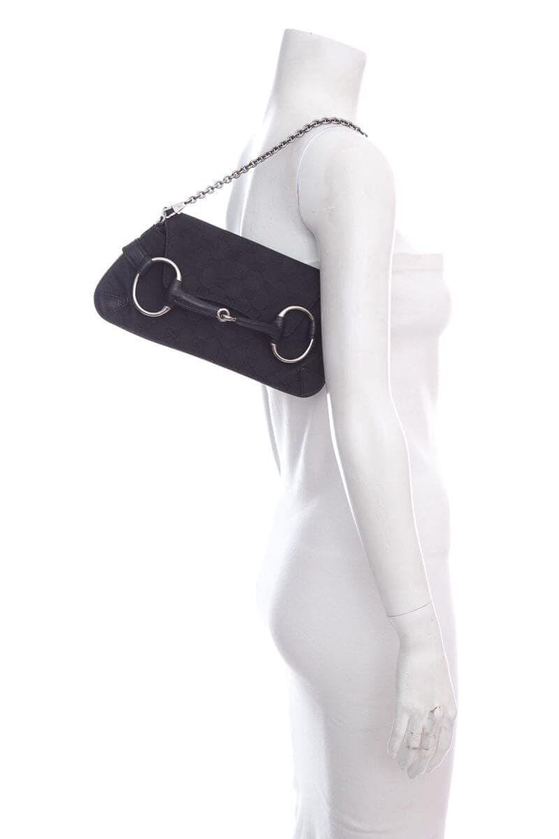 Gucci Black Canvas Monogram Horsebit Handbag. This item is in good condition; very light wear to piping.