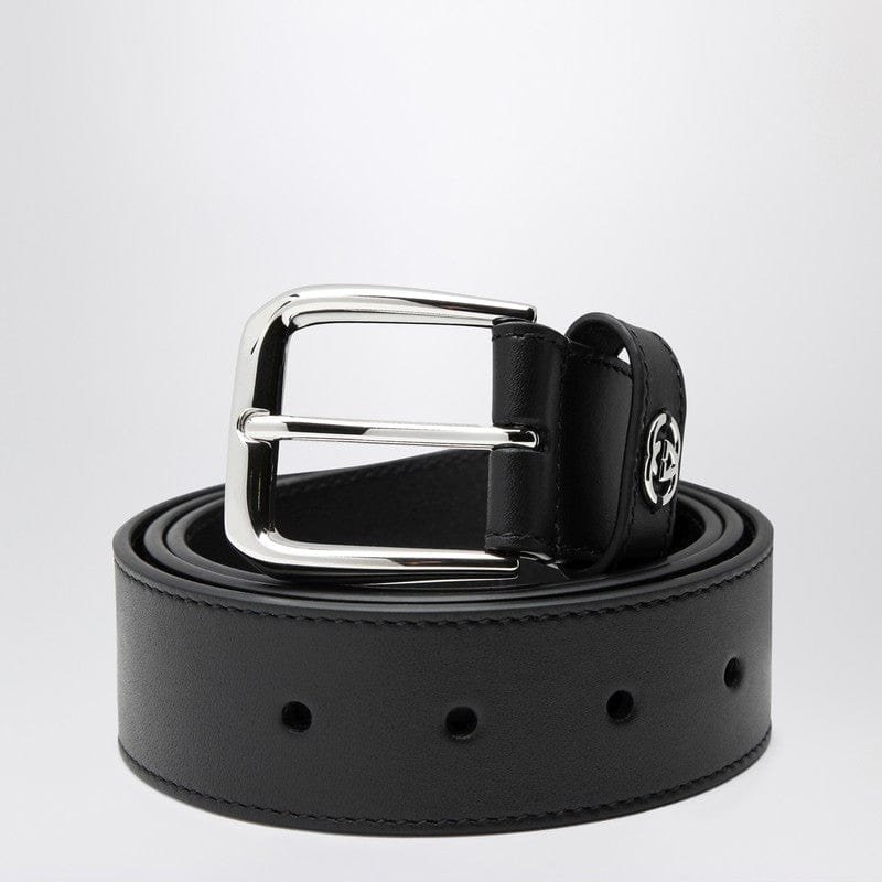 Black leather belt from Gucci featuring an adjustable size, silver-tone hardware, a square buckle and a loop with GG crossover logo detail. Height 3,5 cm Model wears size 90 EU Model measurements: Height: 185 cm Chest: 100 cm Waist: 83 cm Hips: 92 cm