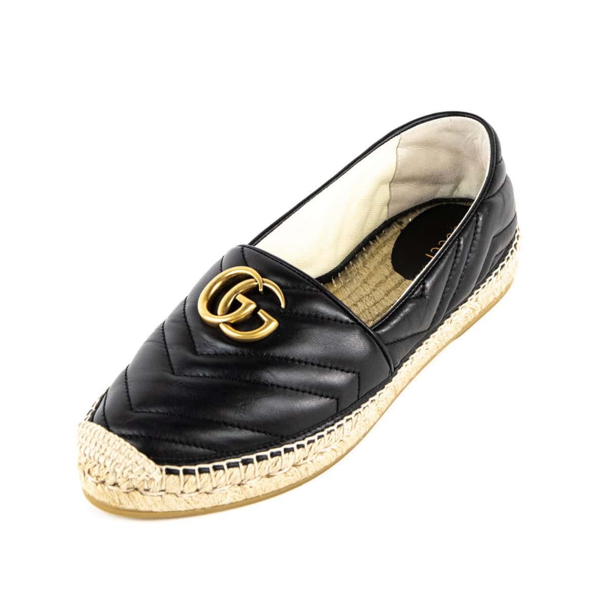 A practical silhouette with a statement-making design, these Gucci shoes are a casual footwear staple. Crafted in Spain of a quality black leather, this luxury footwear presents an espadrilles silhouette with a round toe and a beige jute trim. The upper section presents a matelasse finish creating texture, while the house’s signature double G logo embellishes the uppers in an aged-gold hardware, and rubber soles increase comfort. For a contemporary look, wear this Gucci footwear with a ruffle tiered dress, and a trendy backpack.