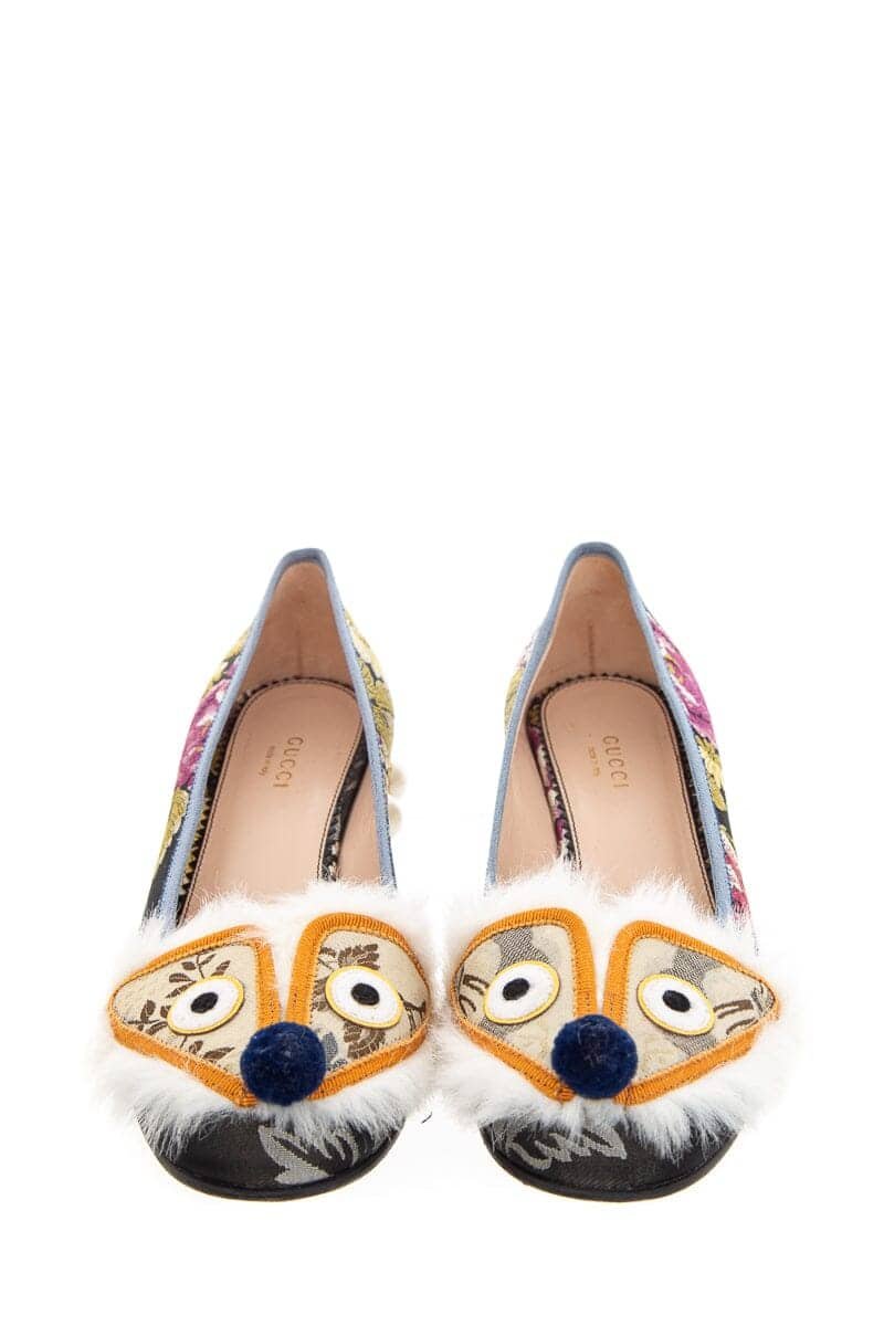 Gucci Black Multi Color Floral Kimberly Jacquard Heel w/ fur toe detail and pearl and stud detail. This item is in good condition; some wear on bottoms.