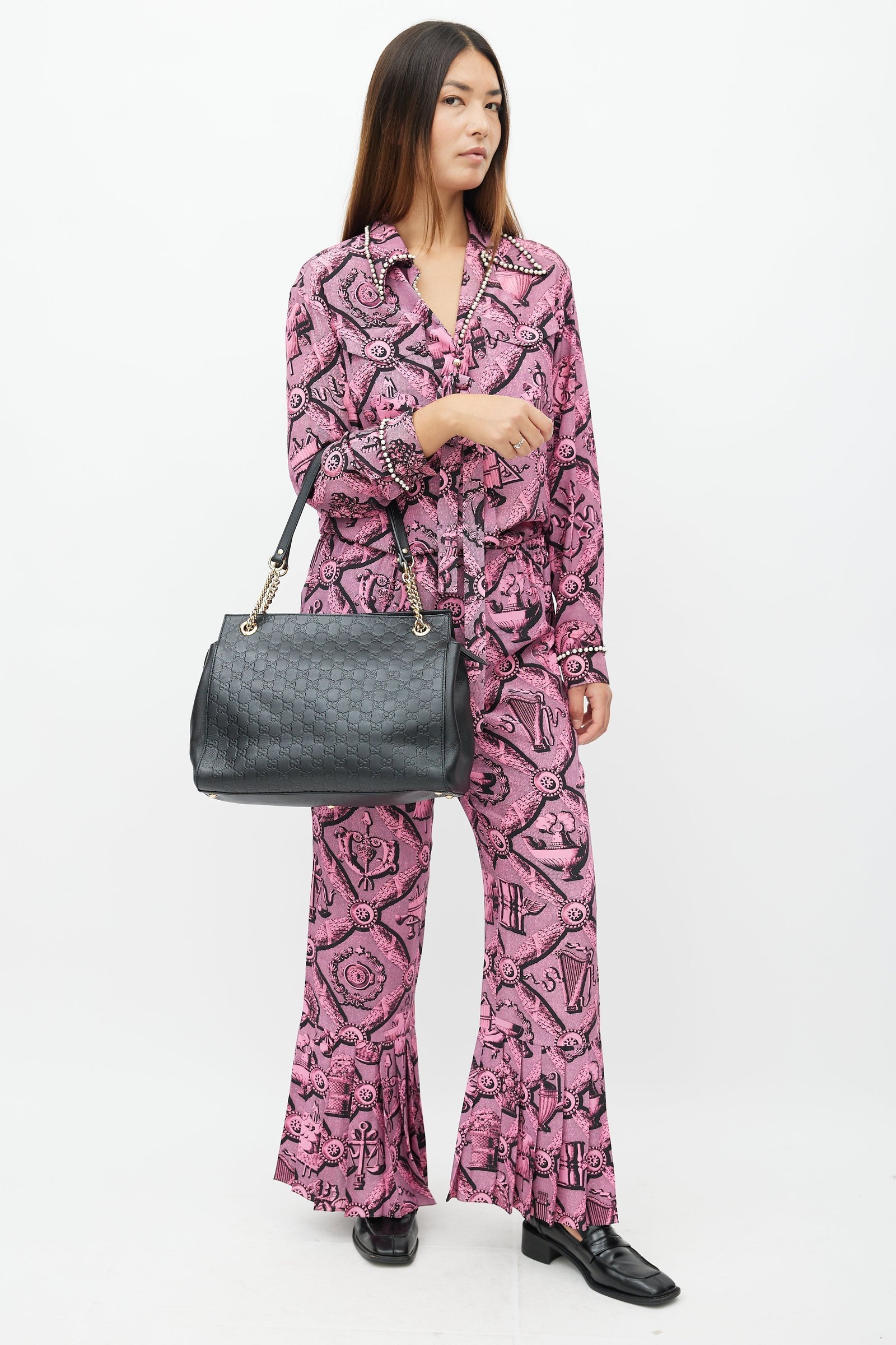 Gucci black shoulder bag featuring signature Guccissima monogram leather, gold tone hardware, chain and leather shoulder straps, zip closure at top, suede lining, and slot and zip pockets inside. Comes with original dust bag.