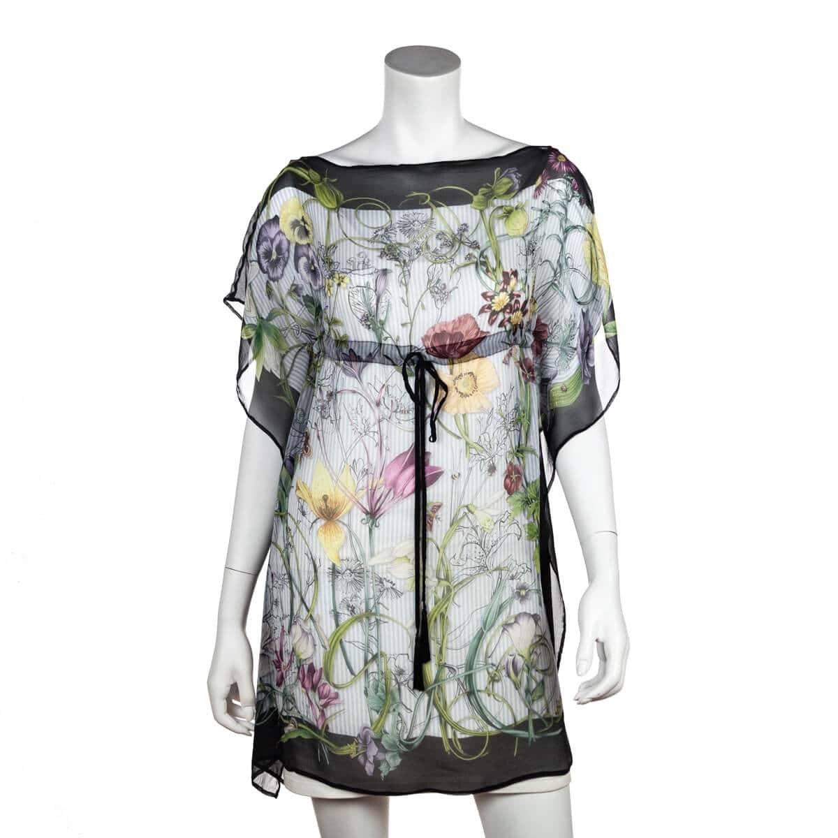 This Gucci Flora Swim Cover-Up is a flirty resort staple that you will not want to miss out on! Made from the finest Italian silk, this unlined black lightweight swim cover-up showcases a high rounded neckline and flowy kimono style sleeves. The Italian fashion house’s signature multicolor ‘Flora’ print adorns the front for added playfulness. An adjustable drawstring closure can be tightened at the center of this piece with the help of the black fabric ties, which feature two tassels along each end. Style this mint condition Gucci Swim Cover-Up with your favorite swimsuit, and luxury sandals on your next vacation.