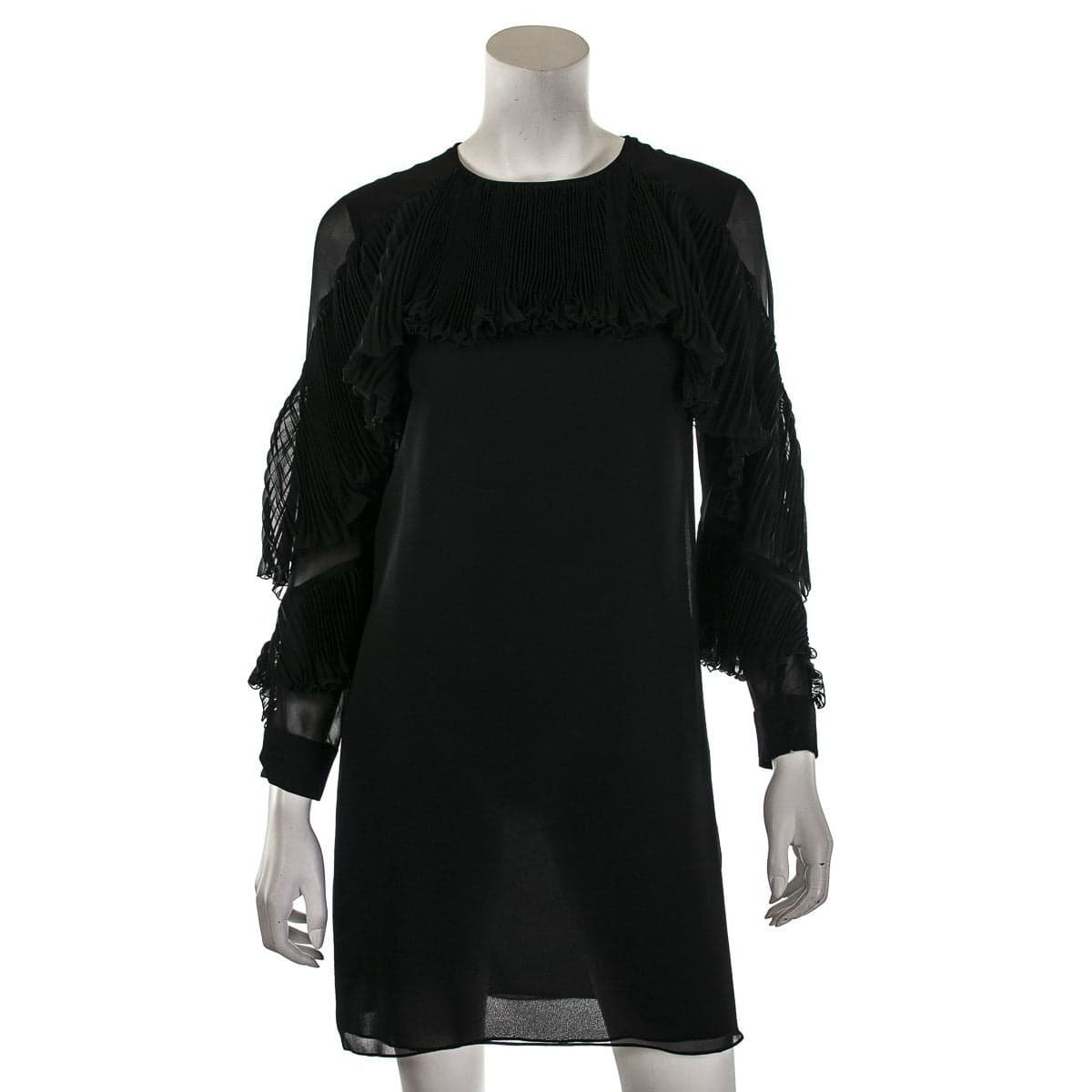 Combining feminine and modern touches, this Gucci dress is a perfect pick for any evening event. Crafted in Italy, of a silk georgette fabric, it features long ruffled pleated sleeves with contrasting sheer panels . A round neckline adds a simplistic element, while the same pleating adds texture to the yoke. There is a button closure securing the back of the dress and the sleeves, and a full lining at the interior. Wear this Gucci design paired with a pointed toe shoe and drop earrings for an elegant outfit.