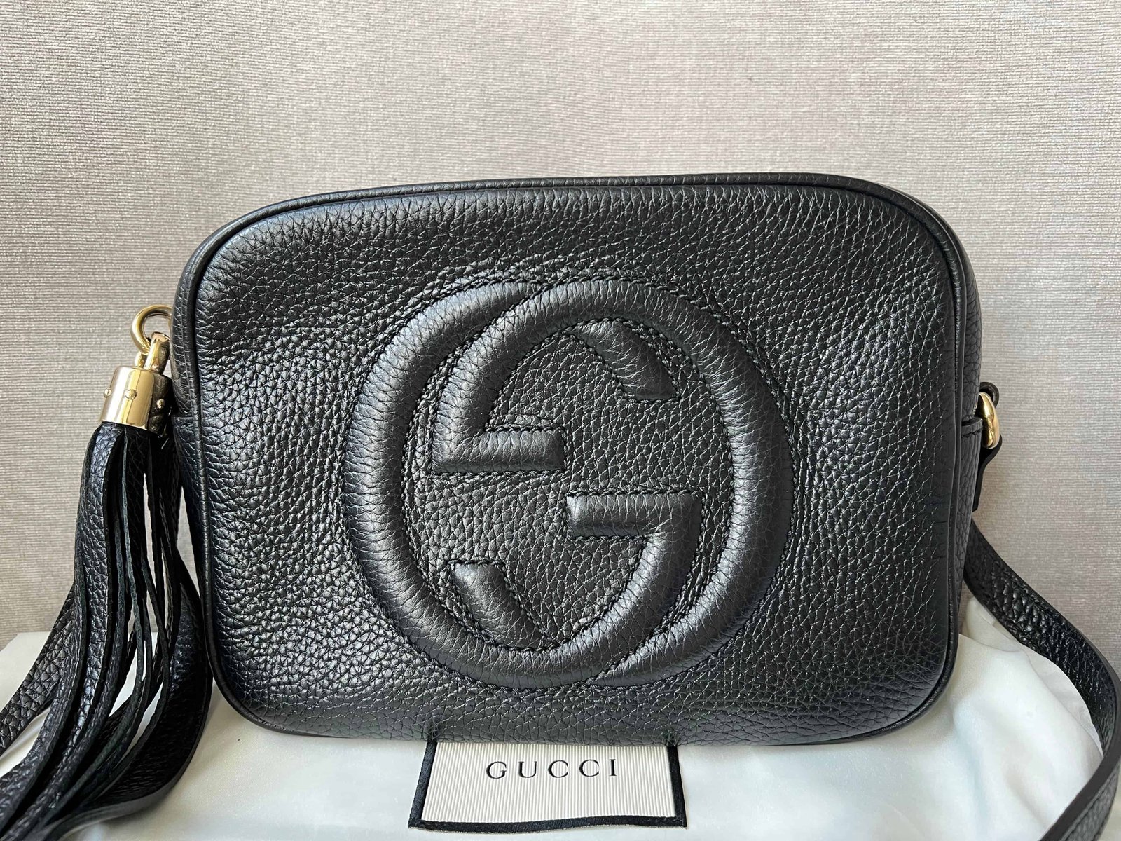Gucci Soho Disco in Black Leather with pale gold hardware. This practical, cross body, camera style bag is compact in size but still fits a reasonable amount. Can be over shoulder or cross body. Gucci’s most popular style and goes with any outfit, dressed up or down.