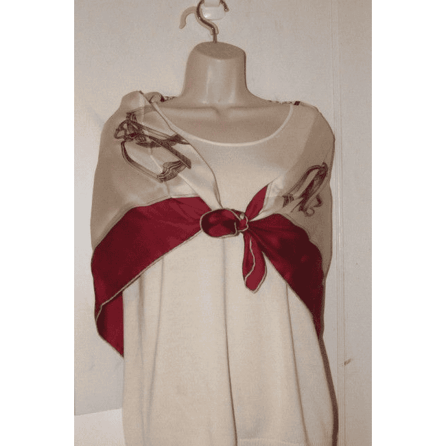 For sale is a Gucci, logo and equestrian print, 35′ square, 100 % silk scarf in red, gold, tan, rust, grey, and navy on an ivory background with rolled edges, a wide band of rust colored trim, an equestrian design in the corners, and the Gucci GG logo design throughout the center! This scarf by Gucci with two of their signature themes creates the perfect, timeless look for you with a lot of style!