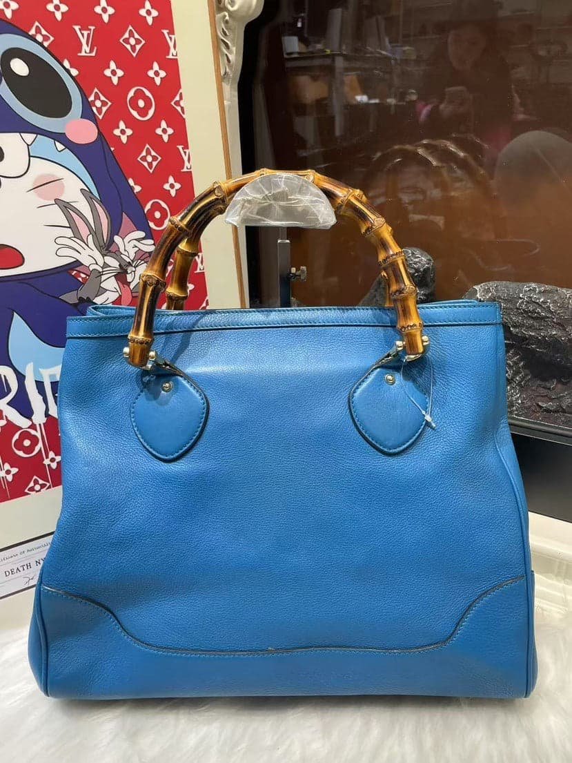 This preloved Gucci Bamboo Handle Top Handle Bag is a beautiful piece perfect for any collection of vintage Gucci bags. Crafted from luxurious blue leather, this used designer handbag features the iconic bamboo handles and gold hardware, embodying timeless elegance. The interior is lined with durable beige canvas, providing ample space for your essentials. Own a classic statement piece that elevates any outfit with sophistication.