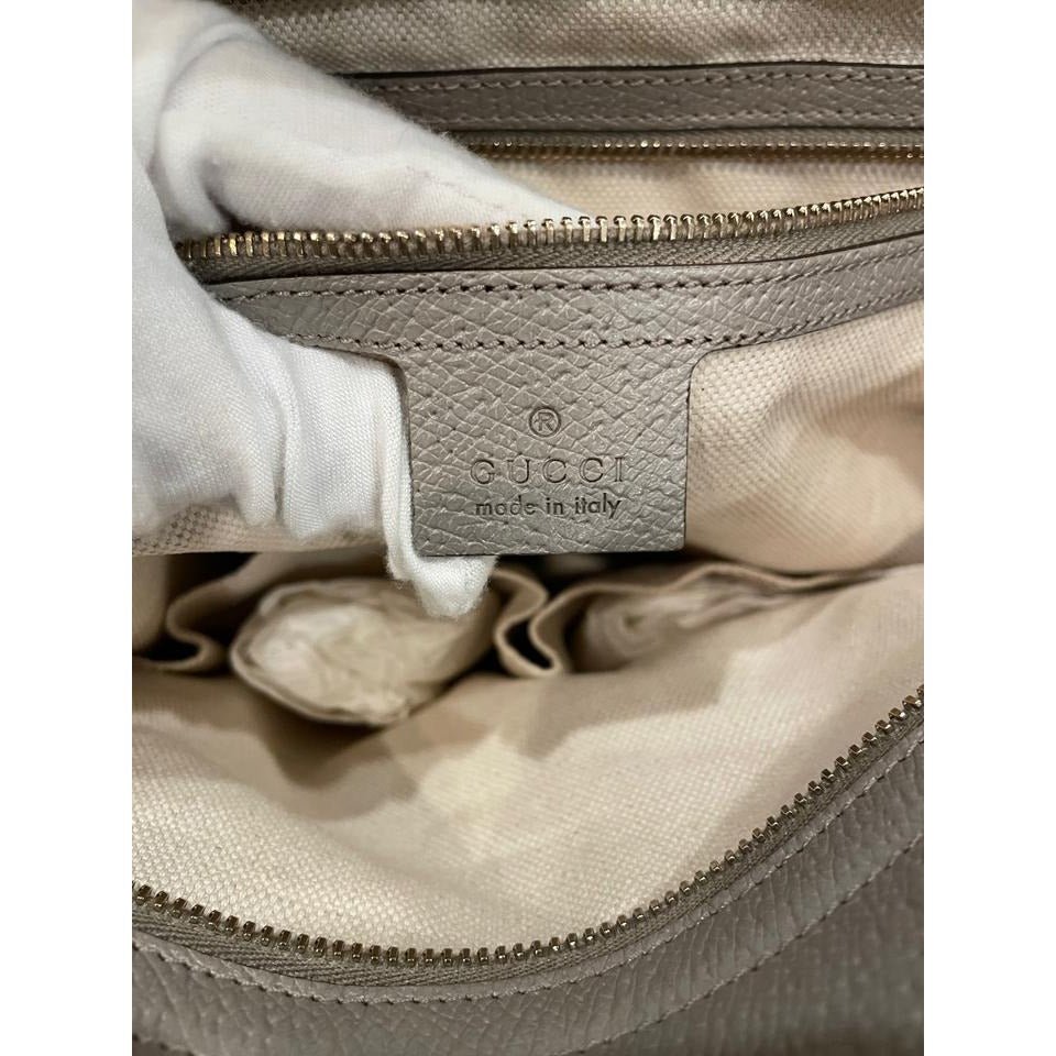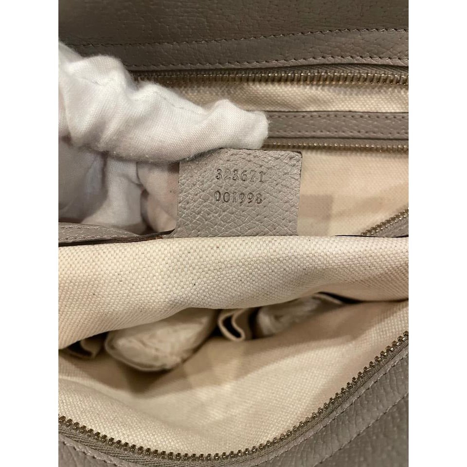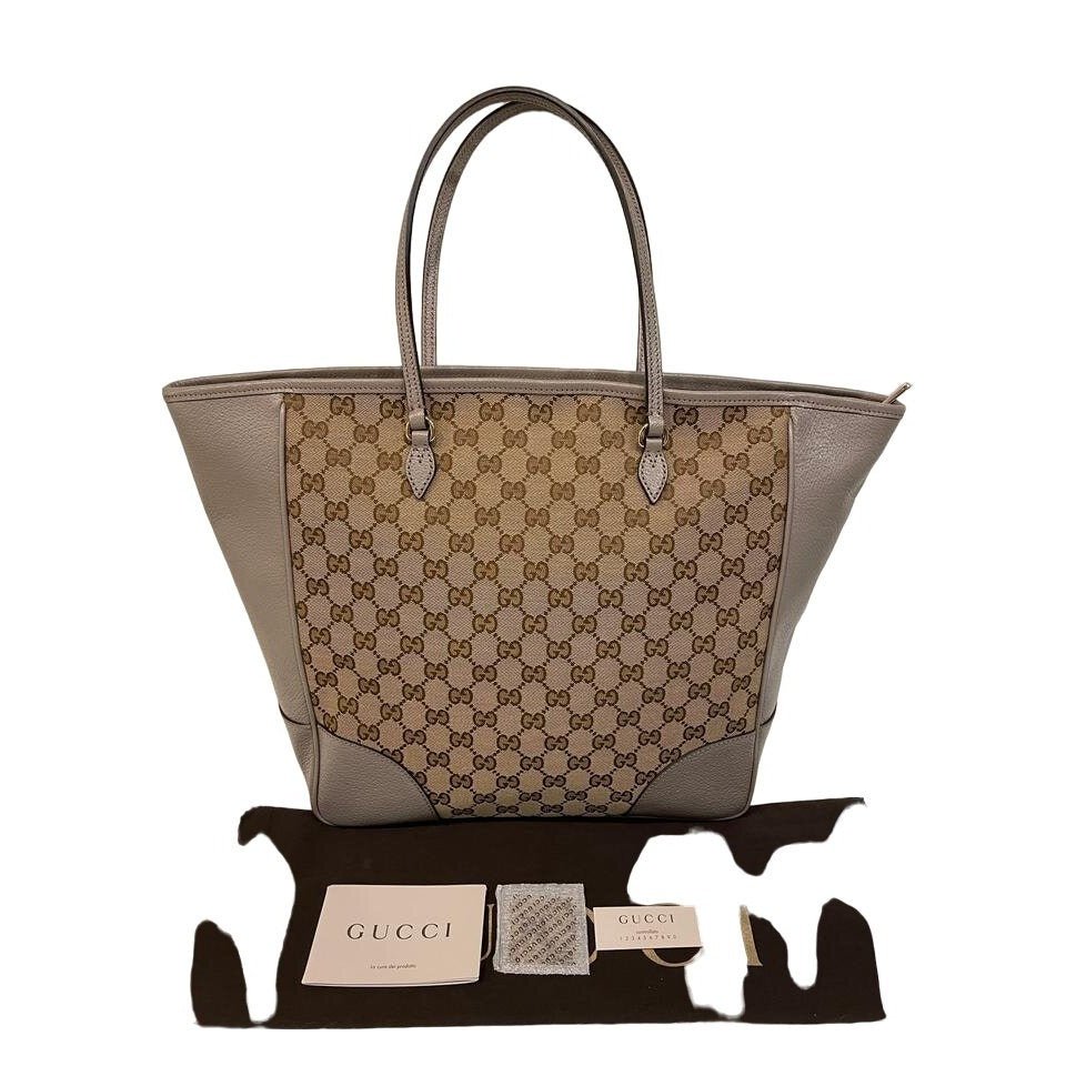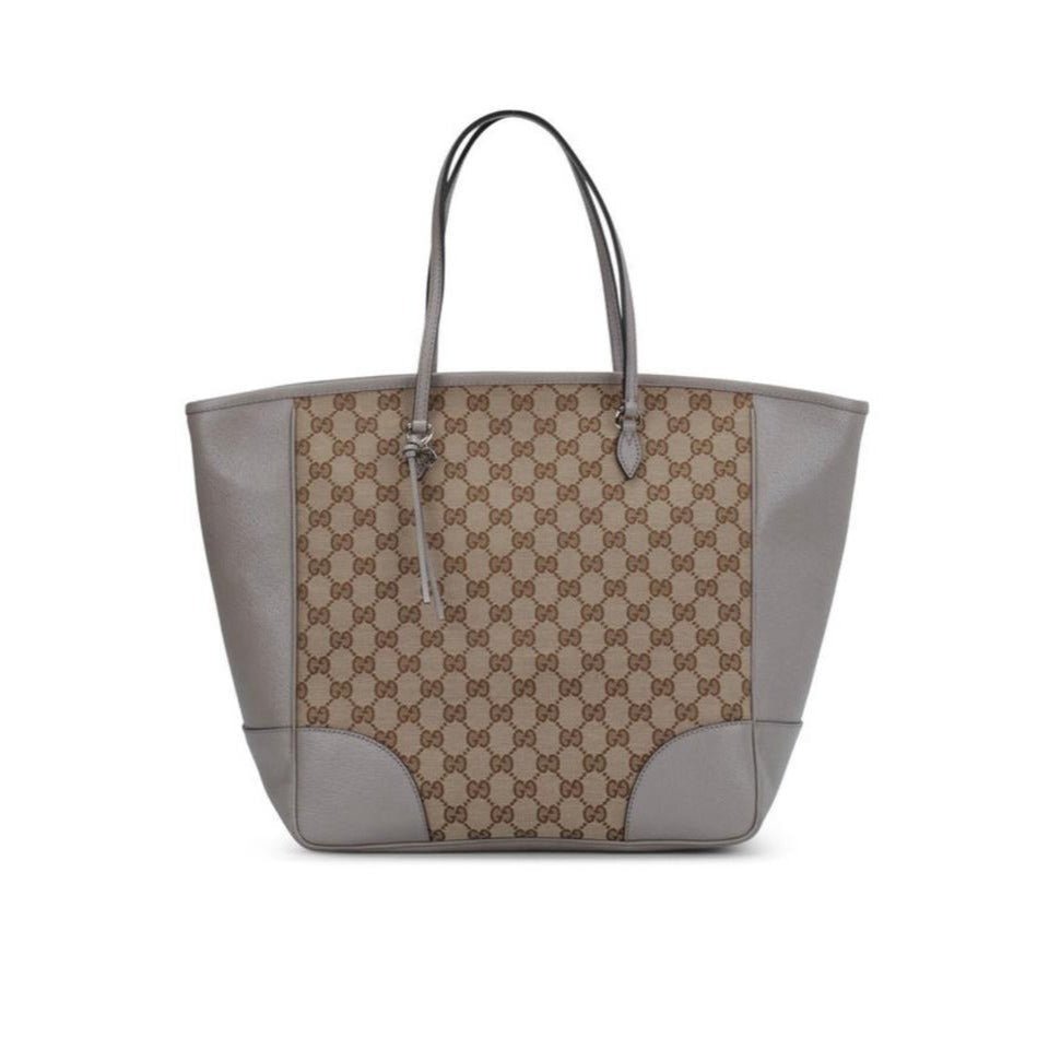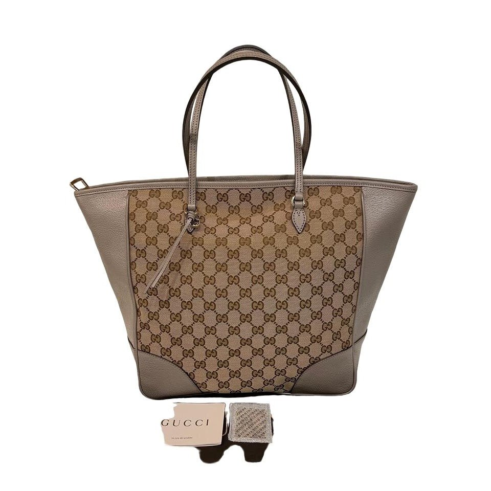 The purse is a classic, zip top closure satchel or tote style shoulder bag with two thin, flat leather straps that allow it to be worn as a shoulder or handheld bag. The body of the purse is made of brown large Guccissima print canvas and silver grey leather . It has leather accents at the top trim, straps, and where the straps attach. It has chrome accents as the footed bottom and on the sides to attach the straps engraved ‘Gucci! It is a gorgeous purse with lots of room, perfect for an everyday signature piece! It is timeless and would work with any outfit!