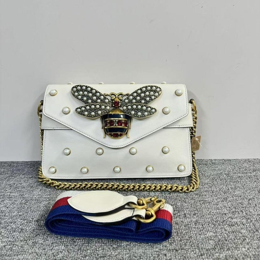 Indulge in luxury with this exquisite designer piece. The iconic bee detail adds a touch of elegance and charm, perfect for any occasion. Crafted from high-quality materials, it offers both style and functionality. A must-have accessory for the fashion-conscious individual.
