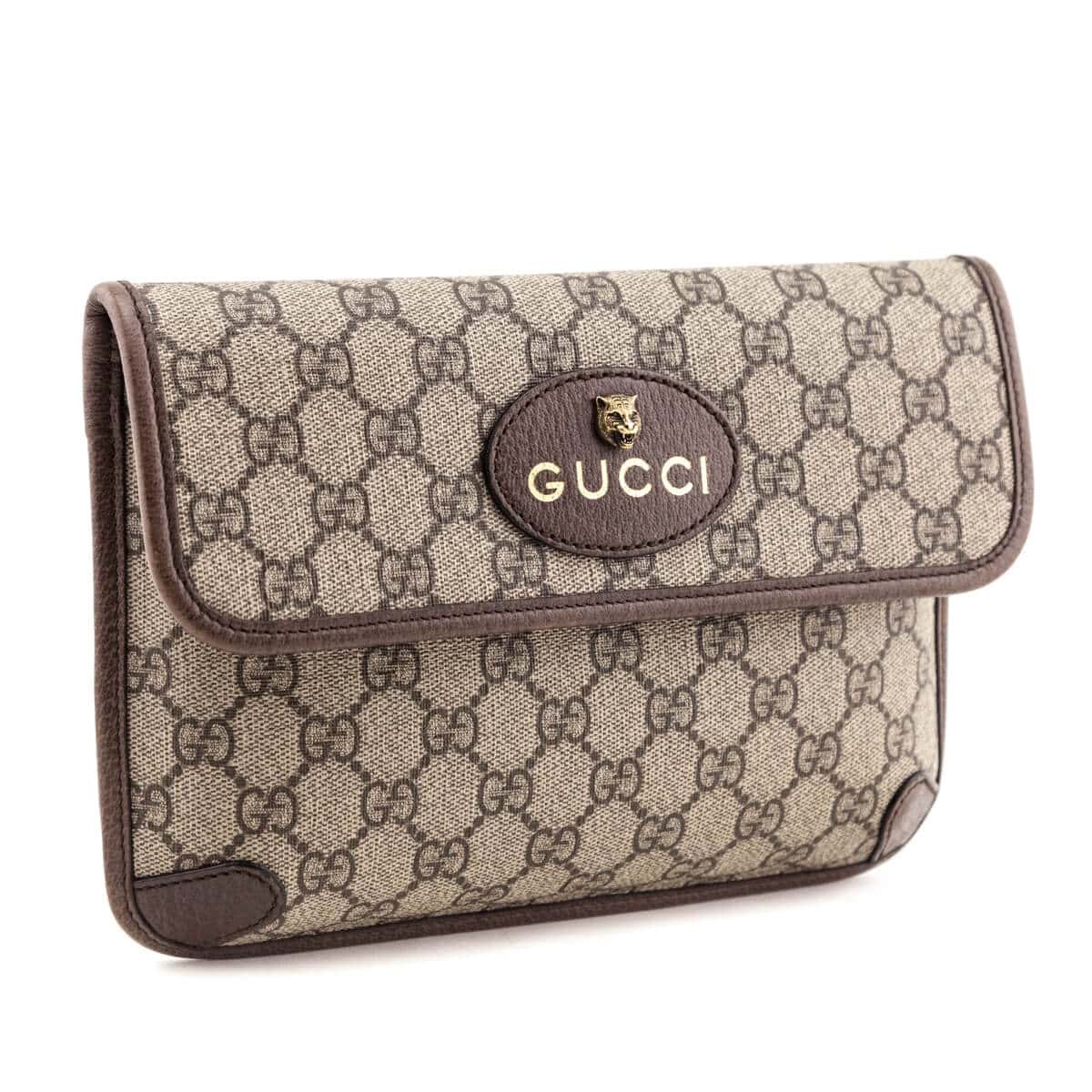 Elegant and understated, a hallmark of many Gucci handbags, this current season Gucci Neo Vintage Belt Bag is poised to become your go-to luxury accessory. The iconic GG Supreme monogram adorns the beige canvas body, accented with brown leather and aged gold-tone hardware. The adjustable webbed waist strap, featuring Gucci’s signature green and red design, includes a black plastic side-release buckle for easy wear around the waist, on shoulder, or across the chest. Prominently featured in front, a brown leather logo plate includes a golden tiger head. Simply lift the flap from the magnetic closure to reveal the beige cotton linen lining, large enough to fit a smaller cell phone. Simple yet striking, this Gucci waist bag is the perfect choice for effortless everyday style.