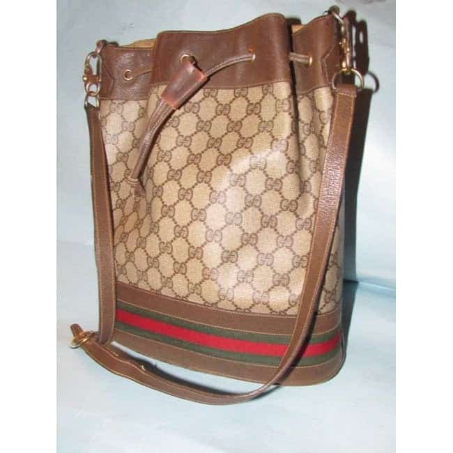 Gucci has brought back this vintage style in its new line- finding the vintage style in this type of excellent condition is almost impossible now! The bag is a brown, coated canvas and leather Gucci purse that is probably from the 1980’s. It is a drawstring bucket / hobo style/ shoulder style with lots of room. It has the large G logo design in dark brown against the tan body and brown leather accents at the top, strap and piping. At the bottom is a wide Sherry stripe accent in red and green! This is a perfect signature purse for everyday and any time of year!