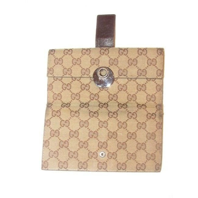 The wallet is made of a brown large G logo print canvas on the exterior with the body and interior in brown leather. It is a large, checkbook style wallet with a chrome disk engraved with ‘Gucci’ on one side and a leather strap that snaps close to secure your cash, checkbook, and cards on the other side. There are slots for your checkbook, ID, and lots of credit cards! The wallet is in great condition!
