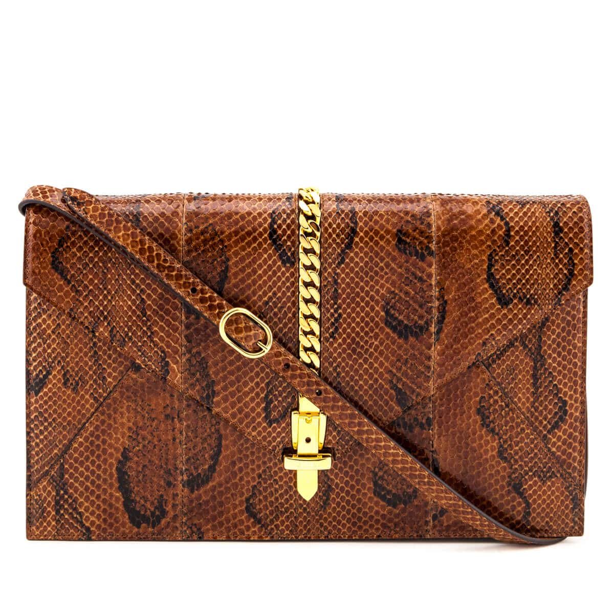 An exquisite exotic from the house of Gucci, this Sylvie 1969 Shoulder Bag is a true piece of wearable art! The brown-toned python bag is designed in an envelope silhouette, with the classic Gucci Slyvie bag gold-tone hardware lining the front, ending in a faux-buckle that doubles as a twist-lock closure. The adjustable matching flat strap creates a top handle or shoulder wear styling, but can also be removed to carry along as an oversized clutch bag. The interior is crafted in dark brown and beige smooth leather, featuring a snap button slip pocket at the back, and an open spacious slip pocket along the front. A true standout piece, chock full of luxury finishings, this Gucci Brown Python Sylvie 1969 Shoulder Bag will be in your collection lineup for many many years to come!