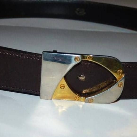 Gucci, vintage, brownish burgundy leather, large, two- tone, open center buckle with equestrian nail head design! The belt is classic yet very eye-catching!