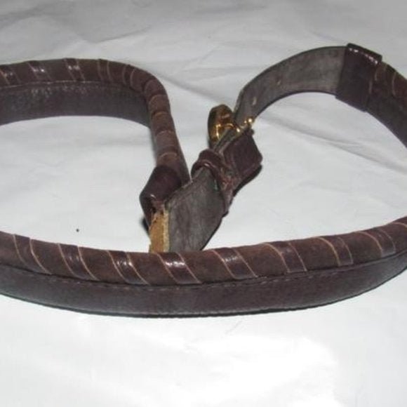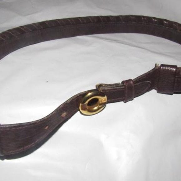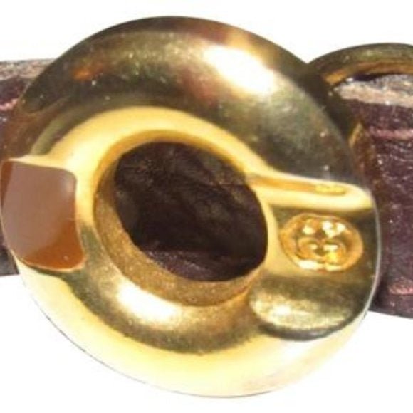 For sale is an early, vintage, Gucci, brown whip-stitched, leather belt with a round, gold with brown enamel and an engraved GG accent open center, buckle and a hook that slides into a hole to secure! The belt is classic yet very eye-catching!