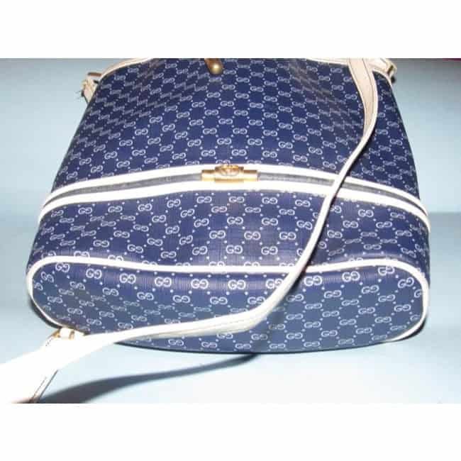The bag is made of a white micro Guccissima print on navy coated canvas and white leather. It is a drawstring bucket / shoulder/ cross body style with lots of room. It has all of the details an authentic Gucci should, like stamped hardware, and serial numbers- see pictures. It has a white leather exterior pocket and interior zip pocket with a fob attached. The strap is really cool with enamel logo accents and is adjustable!