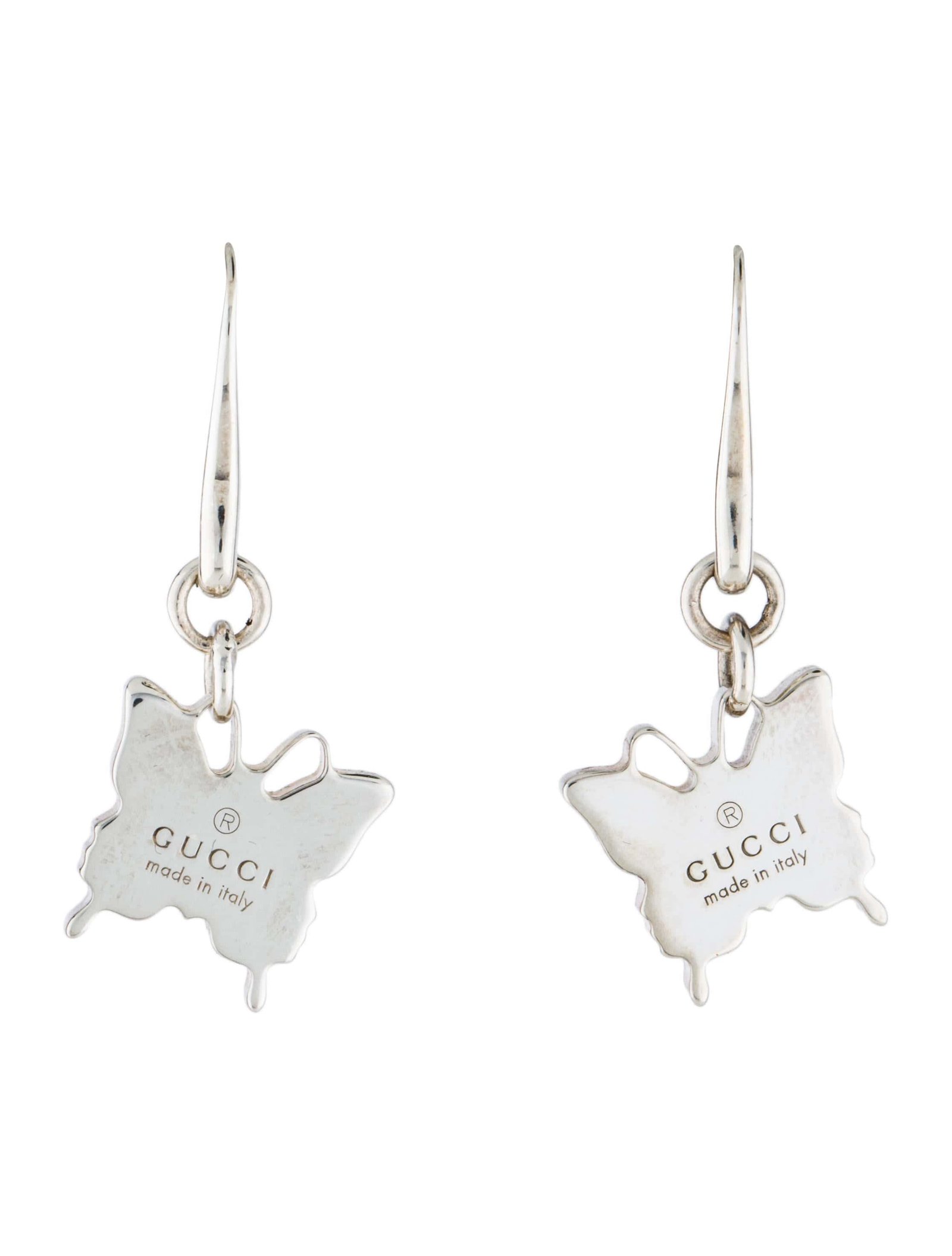 The Gucci Butterfly Drop Earrings in Sterling Silver is crafted in a high polish sterling silver in Italy. These drop earrings feature butterflies engraved with the Gucci trademark, hung from a french style hook closure.