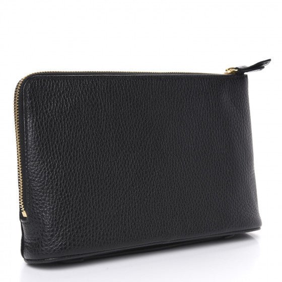 The Gucci Calfskin GG Marmont Clutch in Black is crafted of lovely textured calfskin leather in black. This bag features a top zipper that opens to a beige fabric interior with a zipper pocket and card slots on one side and a single pouch pocket on the opposite.