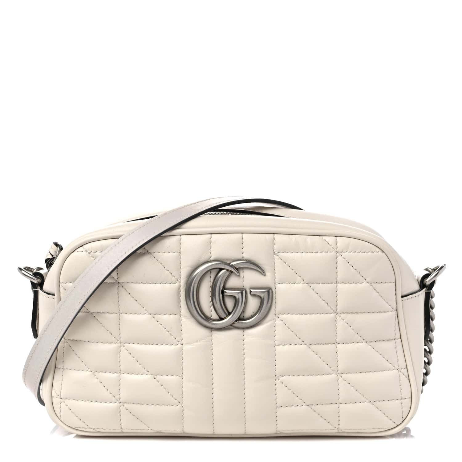 Make a fashion statement with the Gucci Calfskin Matelasse Aria Small GG Marmont Chain Shoulder Bag in Mystic White. Whether you’re heading to a casual brunch or a sophisticated soirée, this bag will elevate your look with its sleek and stylish appeal. Add a touch of luxury to your collection with this iconic Gucci piece that seamlessly combines fashion and function.