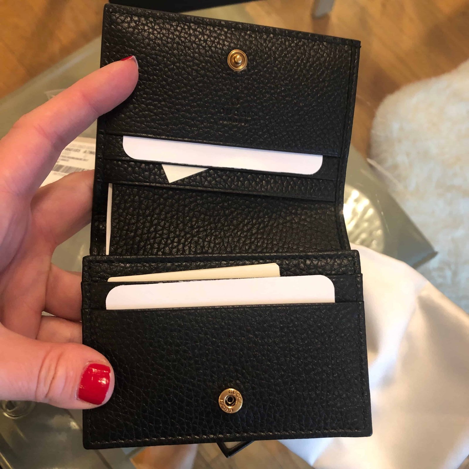 - 5 card slots, 2 slip pockets, 1 zip pocket