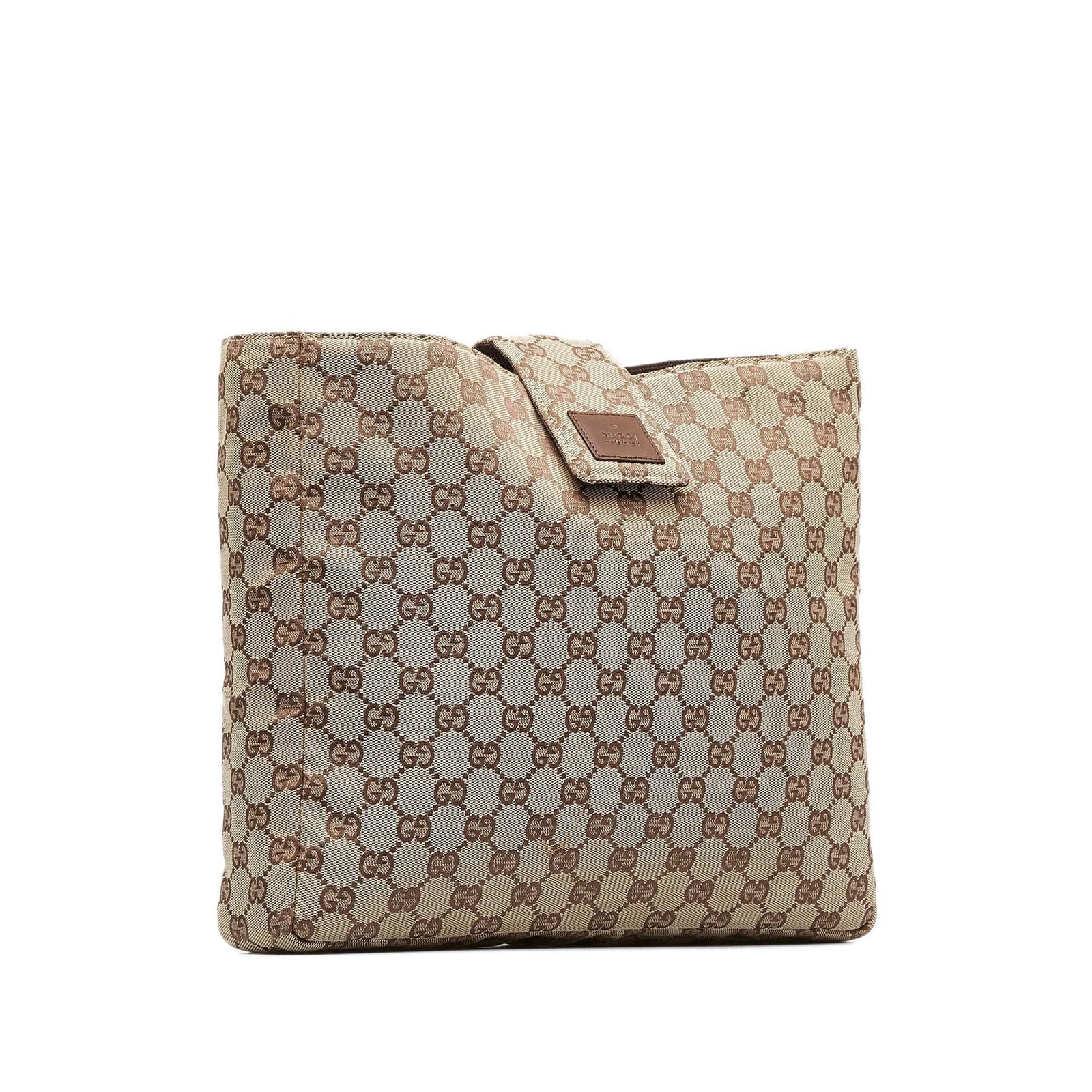This beautiful Gucci clutch is made of the iconic brown coated GG canvas and closes with a strap. It is carried in the hand.
