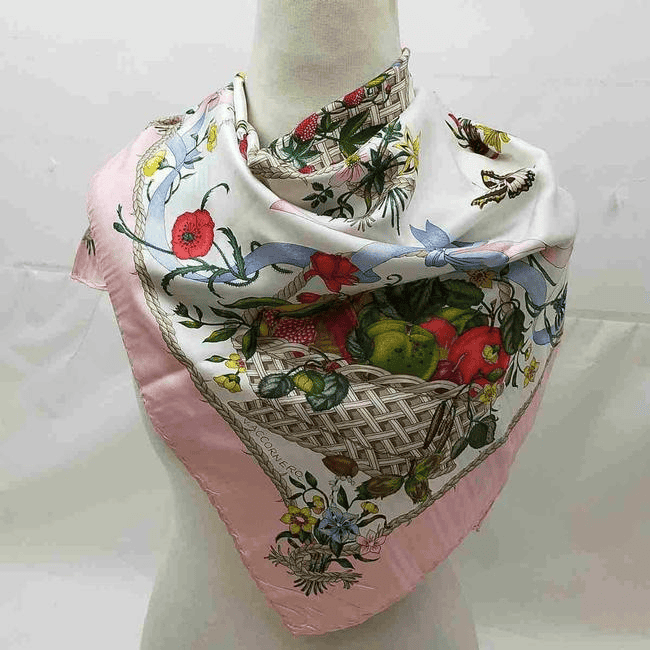 The background of the scarf is ivory and it has a pink border of 2′ around the fruit and floral design. The colors are rich blues, pinks, greens, purples, and golds and the edges are rolled. It is 100% silk, in beautiful condition, and has a tag that reads, ‘Gucci, Made in Italy, 100%Silk/ Seta/ Soie.