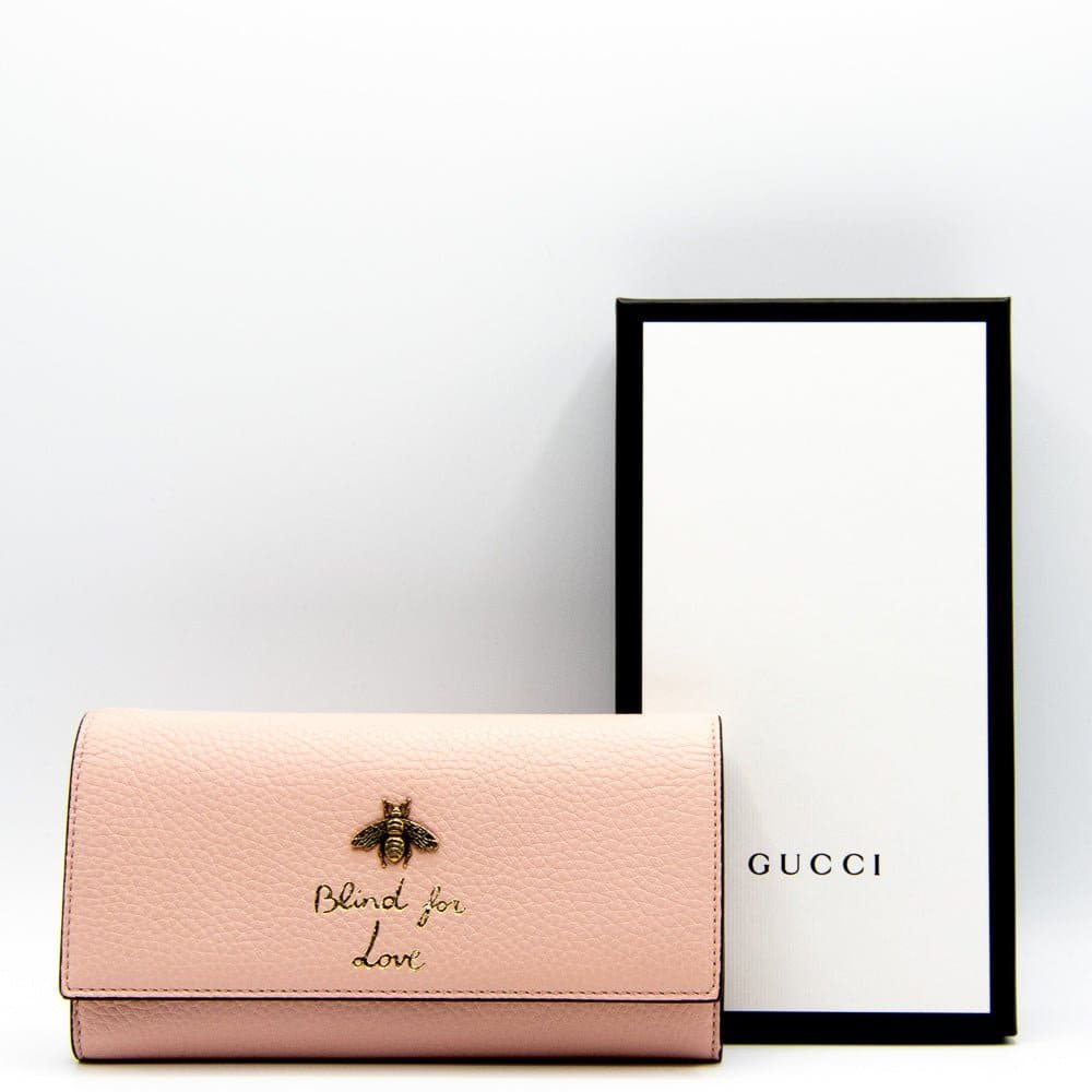 Gucci wallet in pink leather with bee logo and ‘blind for love’ writing. Flap opening.