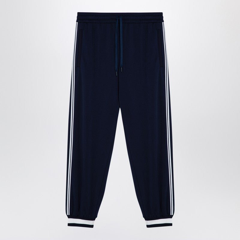 Dark blue technical jersey jogging trousers from Gucci featuring an elasticated waistband with drawstring, a contrasting striped print and lettering logo, two side welt pockets, a back patch pocket and ribbed trim. Model wears size L Model measurements: Height: 187 cm Chest: 102 cm Waist: 76 cm Hips: 92 cm