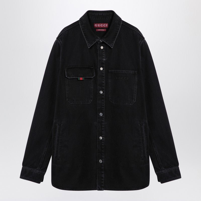 Dark grey cotton denim shirt from Gucci featuring a classic collar, long sleeves with buttoned cuffs, a patch pocket on the chest with lettering logo embroidery, a patch pocket on the chest with flap and green/red/green web ribbon detail, a front button placket, two side welt pockets and a regular fit. Model wears size 52 IT Model measurements: Height: 187 cm Chest: 102 cm Waist: 76 cm Hips: 92 cm