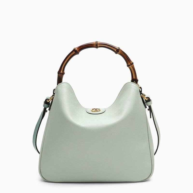 Sage green leather shoulder bag from Gucci featuring a rigid bamboo handle, a metallic GG logo on the front, two removable leather shoulder straps, an internal zipped pocket, faux suede lining and gold-tone metal hardware. Width 29 cm x Height 22 cm x Depth 7 cm Adjustable shoulder strap length I: min 91 cm – max 106 cm Adjustable shoulder strap length II: min 92 – max 108 cm Handle drop: 17 cm