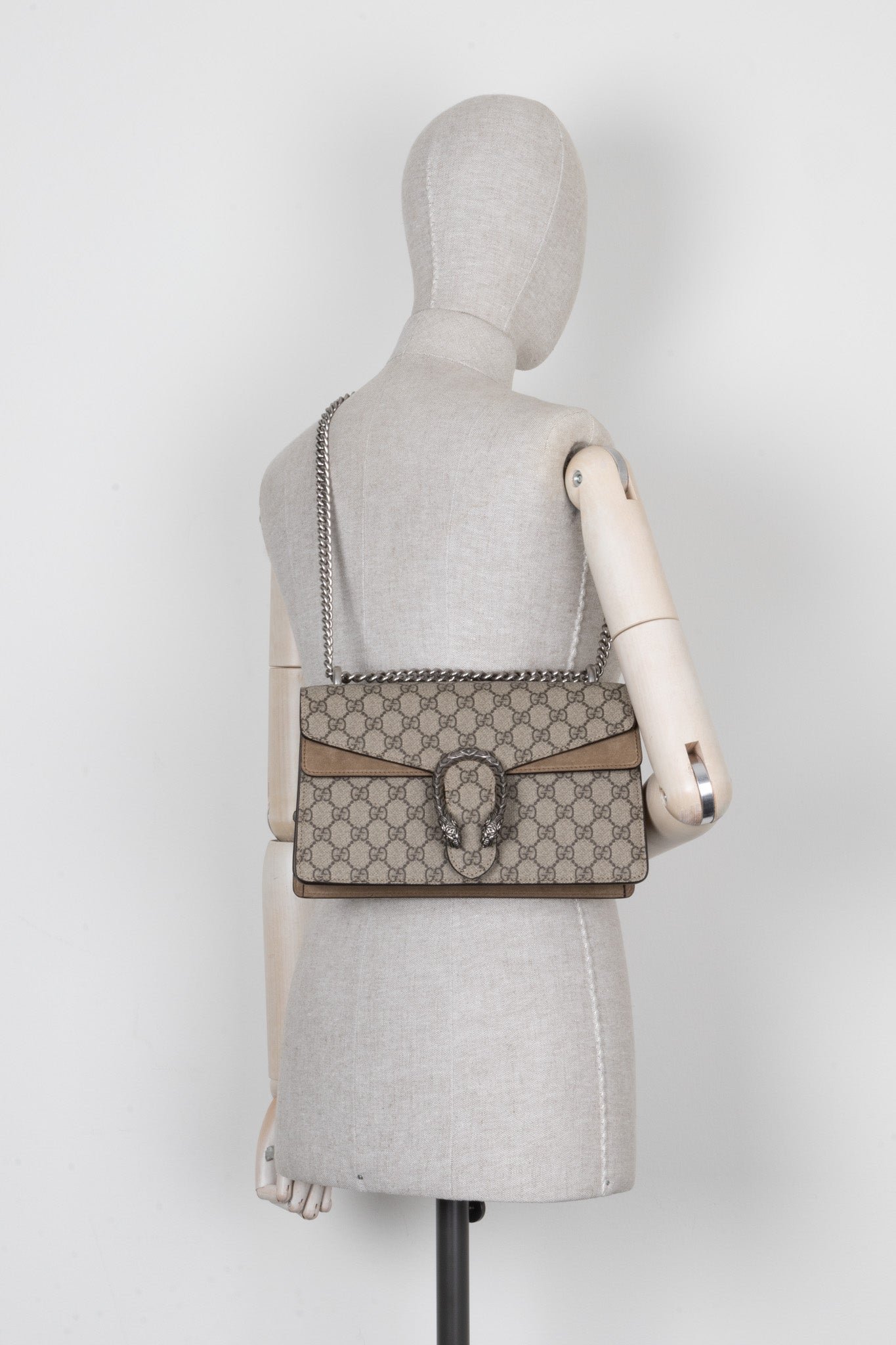 Die Dionysus wurde zum ersten Mal in der FW 2015 Kollektion vorgestellt und entwickelte sich in kürzester Zeit zu einer Gucci Favorite. Das Modell wurde nach dem griechischen Gott Dionysus benannt, welcher für Fruchtbarkeit der Vegetation und Euphorie steht. Man erkennt die Dionysus an ihrem unverkennbaren Tigerkopf Verschluss und den wild verzierten Details welche das Gucci Monogram schmücken.
