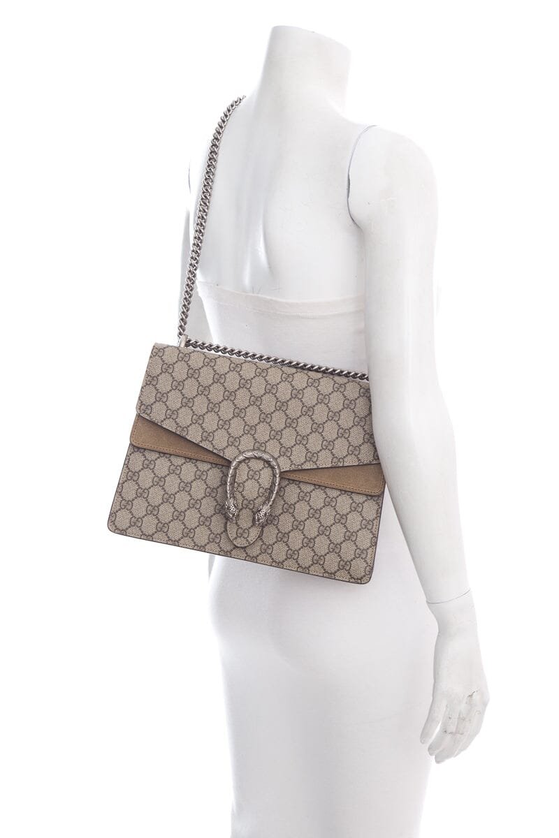 Gucci Dionysus Beige and Ebony GG Monogram Medium Handbag Taupe Suede Trim Antique Silver Hardware Tiger Head Closure. This item is in excellent condition.