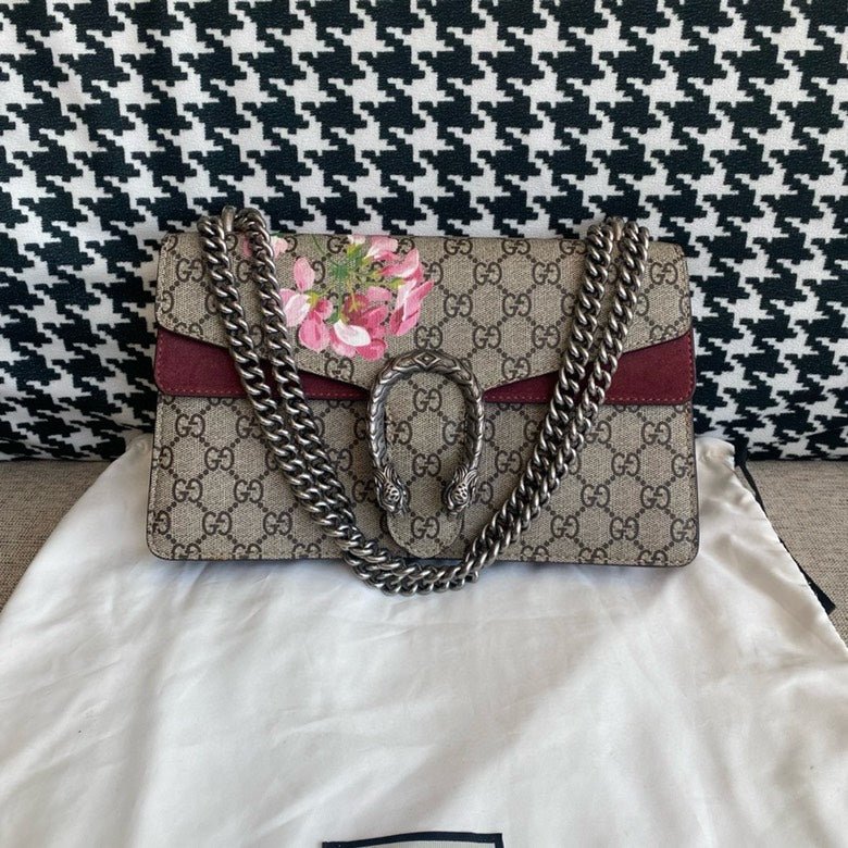 This pre-loved Gucci Dionysus Beige GG Blooms Canvas Shoulder Bag is a stunning addition to any collection of vintage Gucci bags. The elegant design features the iconic GG monogram canvas with beautiful floral accents, complemented by a durable silver-toned chain strap. The interior is lined in rich brown suede, offering luxury and functionality. Perfect for anyone who adores used designer handbags, this piece stands out in both style and prestige.