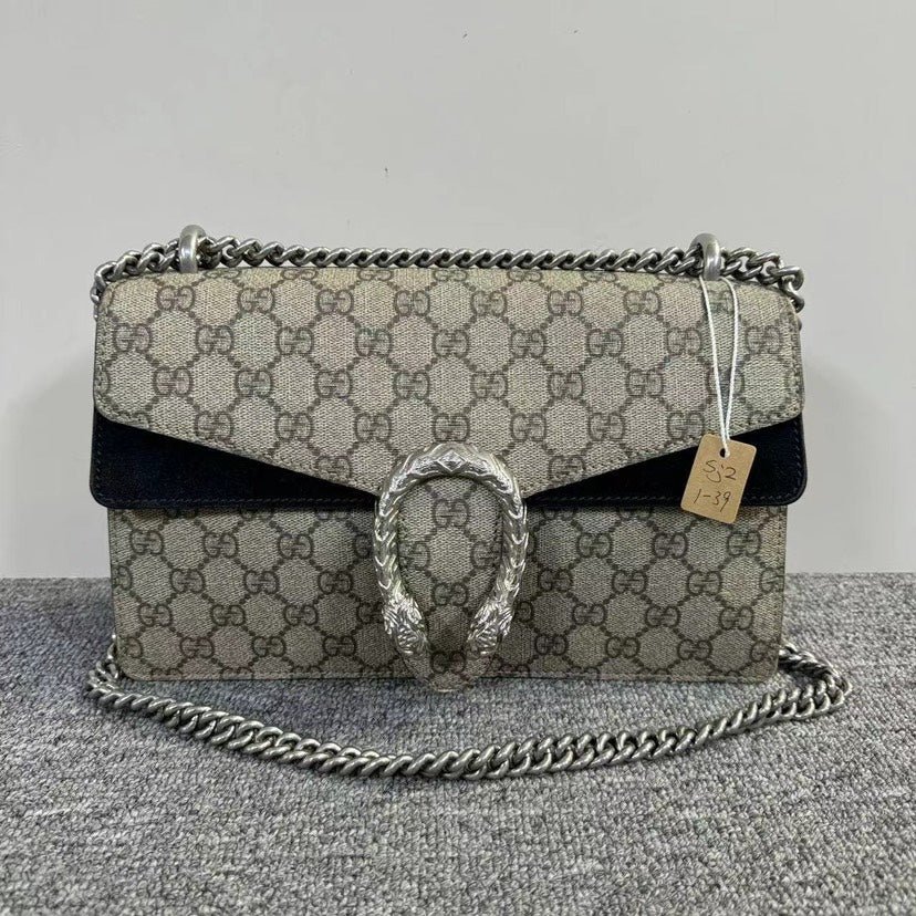 This is an Gucci Dionysus Shoulder Bag. This elegant bag is crafted from Gucci’s iconic GG Supreme canvas in beige. The bag features a textured chain strap in silver-toned metal and a front flap adorned with a distinctive Dionysus buckle. The flap opens to a luxurious brown suede interior with a central zip compartment, making it both stylish and functional.