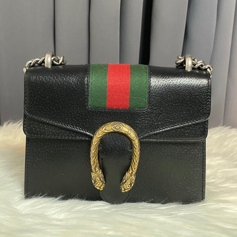 This pre-loved Gucci Dionysus Black Shoulder Bag is a timeless piece for any fashion enthusiast. Crafted from premium leather, the bag features the iconic green and red stripe detail, paired with a signature tiger head spur closure. Its compact size and elegant chain strap provide both comfort and style. Whether you’re expanding your collection or searching for vintage Gucci bags, this unique find is a gem among used designer handbags.